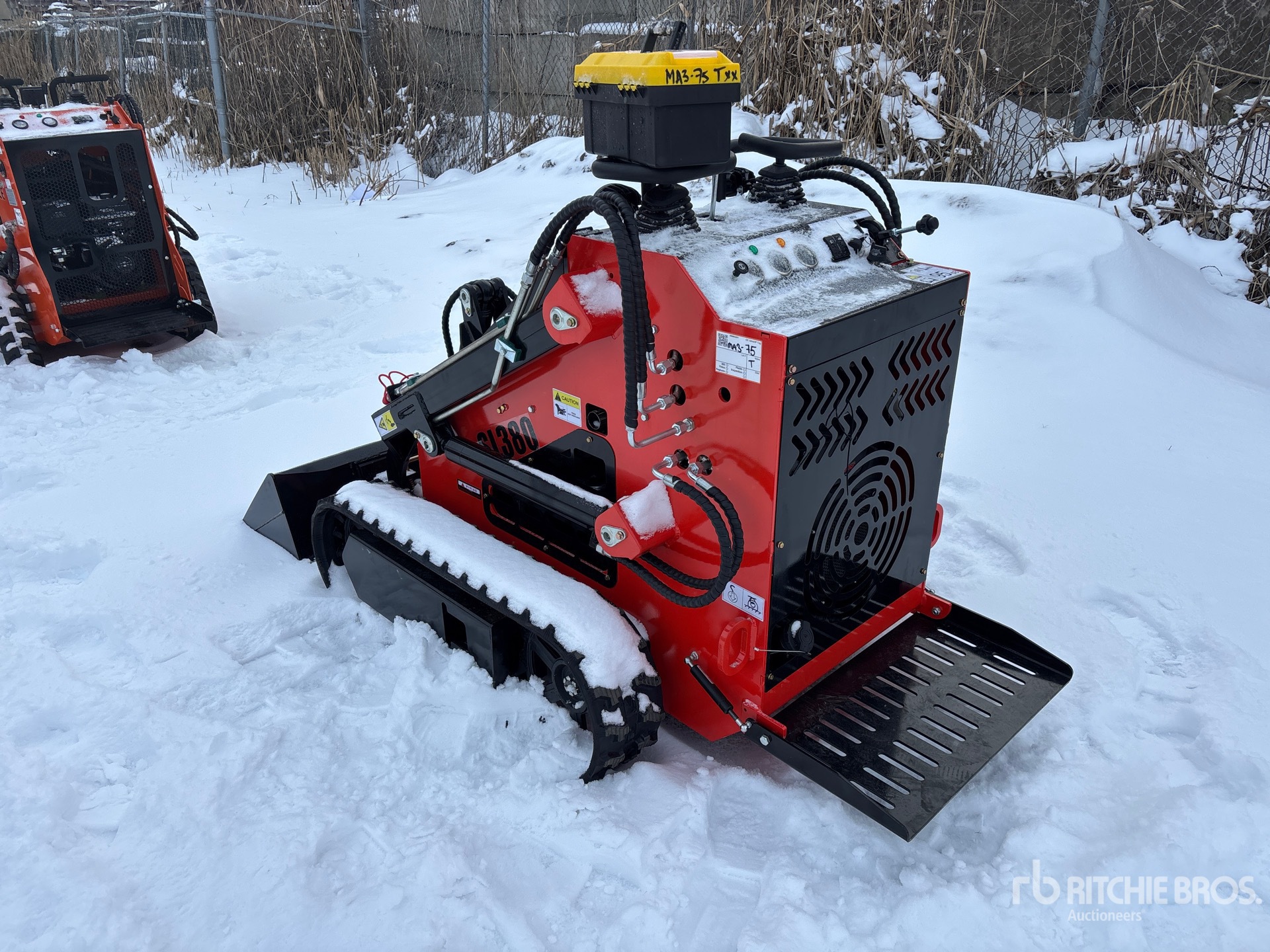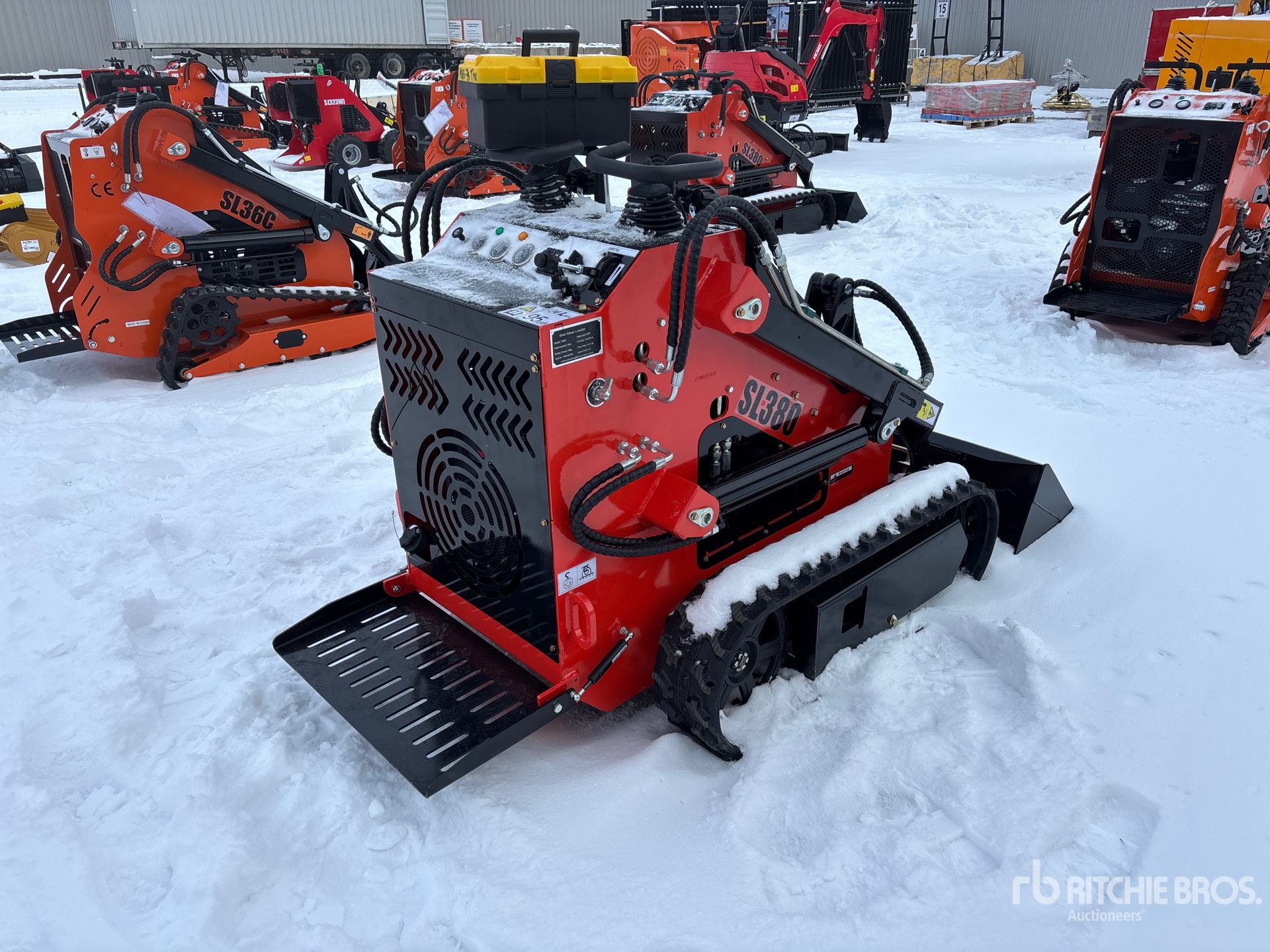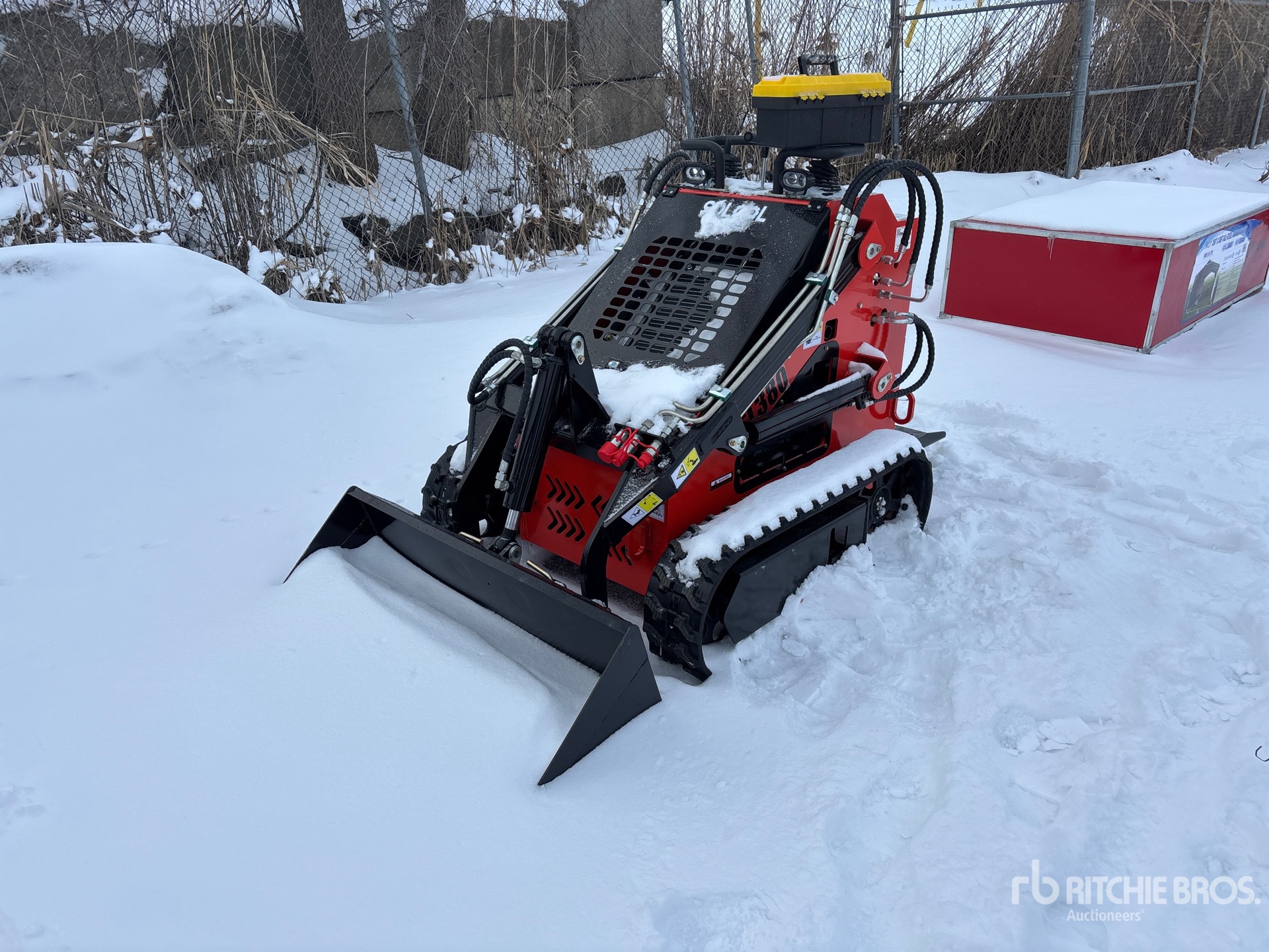 Poste de conduite ouvert, direction par joystick, courroies de chenille de 18 cm (7 po), attelage manuel, godet de 109 cm (43 po)