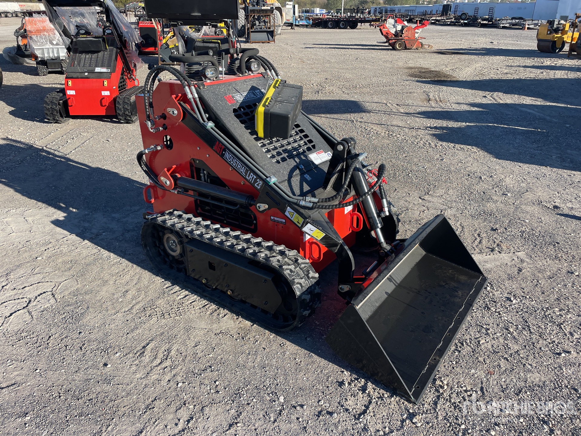 Poste de conduite ouvert, direction par joystick, chenilles de 17,8 cm, attache rapide manuelle, godet de 112 cm. Les images présentées sont des photos d'illustration. Article neuf/jamais utilisé.