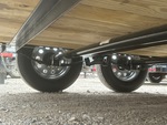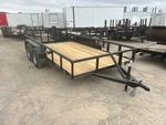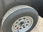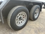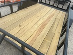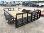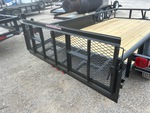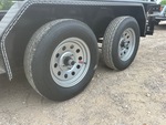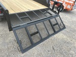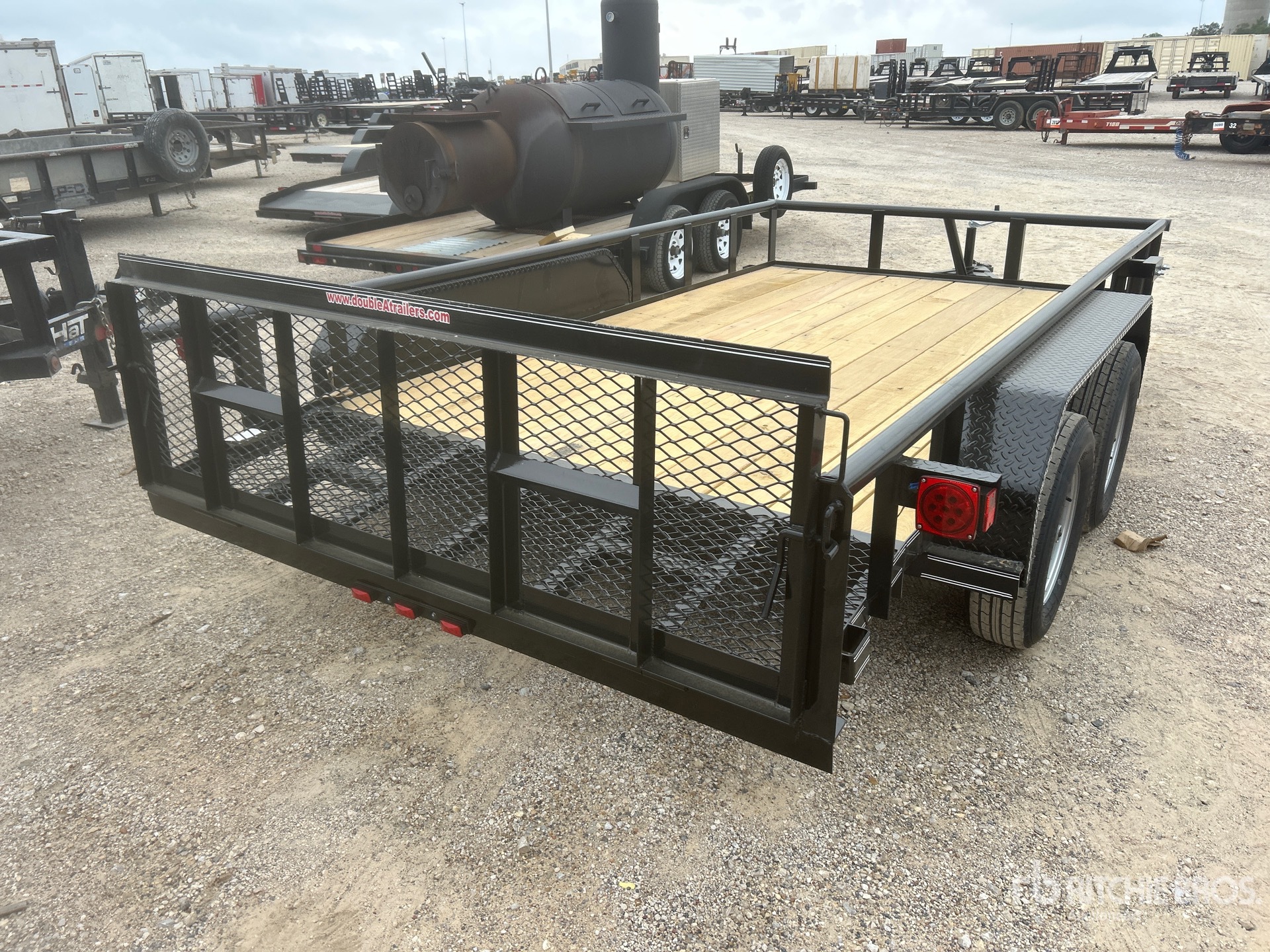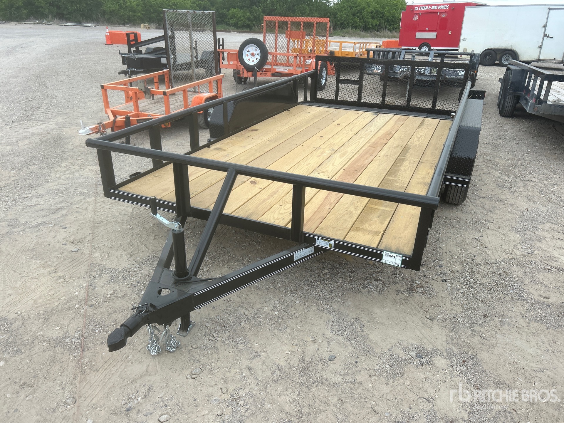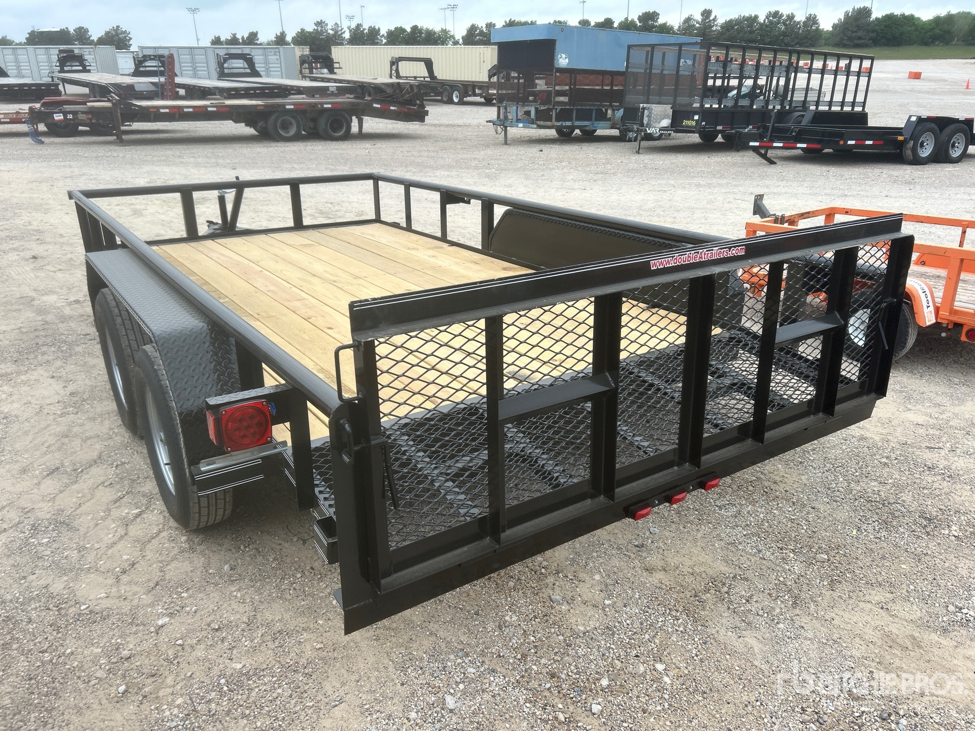 Attelage à boule, suspension à ressorts, largeur de plateau de 208 cm, largeur hors tout de 224 cm, plancher en bois, pneus 205/75R15, PTAC de 3175 kg, châssis 76 x 51 x 4,8 mm, toit tubulaire, attelage de type BD, câblage et feux à DEL, 2 essieux de 1588 kg, entraxe de 127 mm, cric de recul de 907 kg, chaînes de sécurité, prise plate à 4 broches, ailes en tôle larmée, plancher en bois traité de 51 mm, poches pour piquets, hayon métallique extensible de 61 cm avec porte de 61 cm, porte-roue de secours