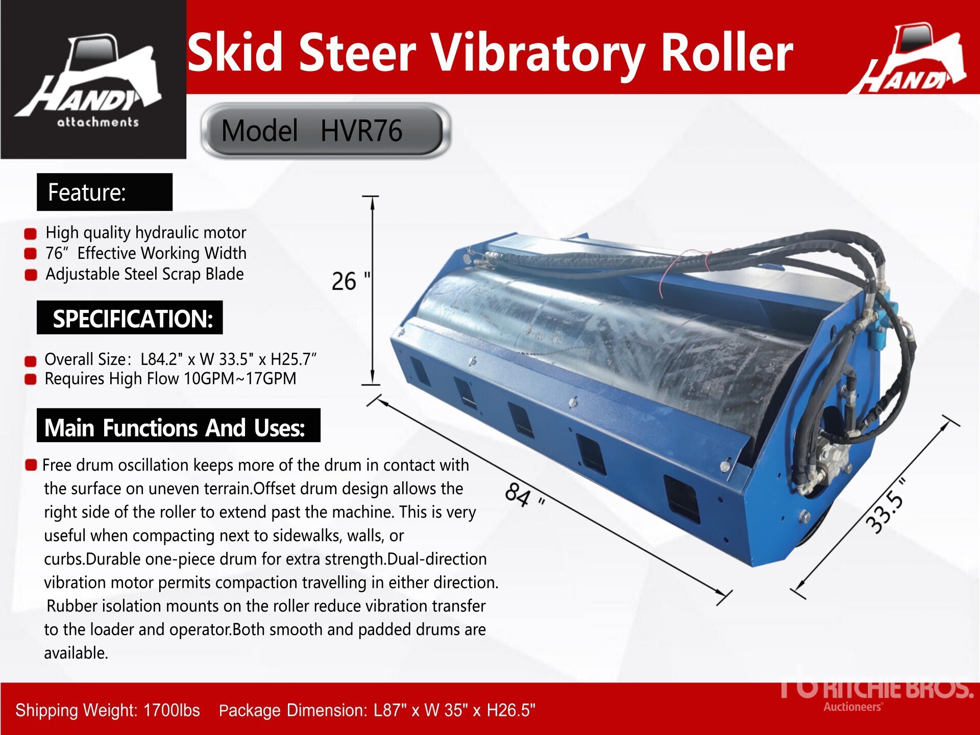 2026 Handy HVR76 76 in Rouleau vibrant pour chargeuse à différentiel (Unused)