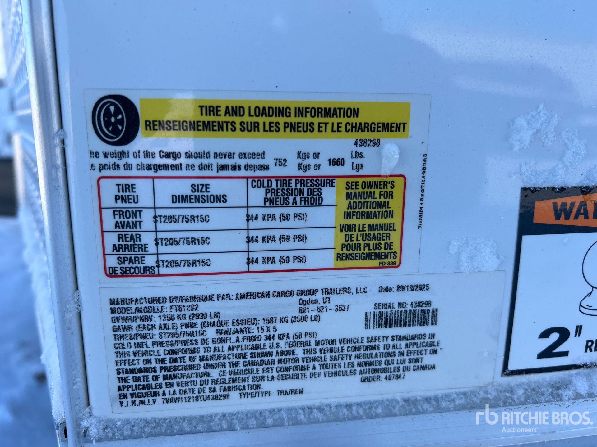 Attelage à boule, suspension à ressorts, freins électriques, largeur de plateau de 173 cm, largeur hors tout de 183 cm, rampe, porte latérale, pneus 205/75R15, PTAC de 1360 kg