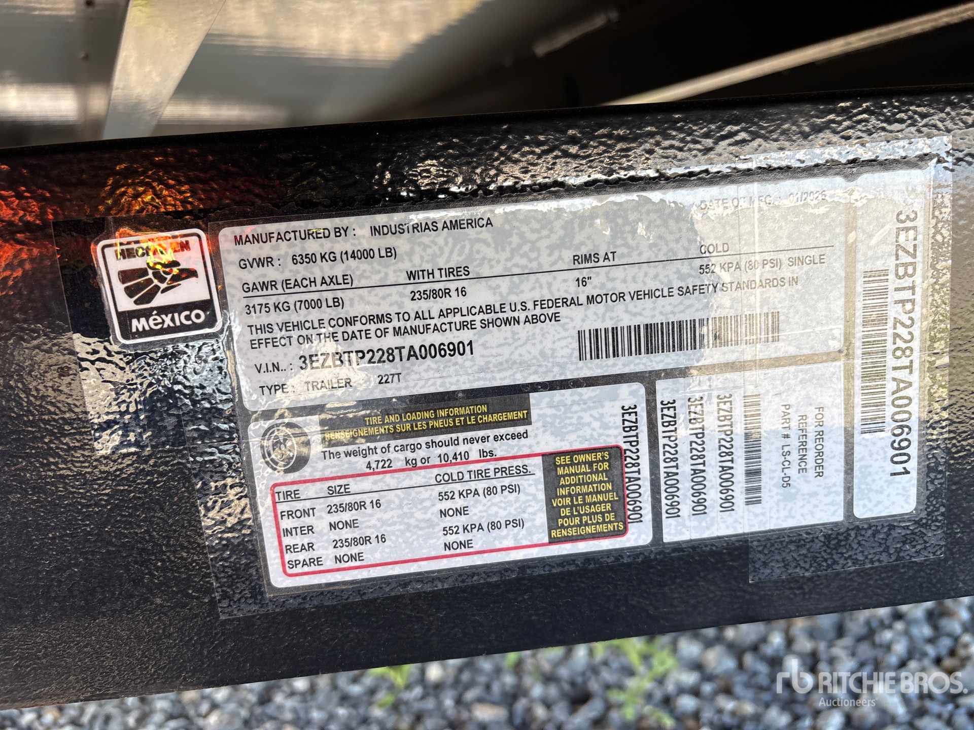 Les Informations détaillées de l’équipement sont d’une portée limitée, et les Encans Ritchie Bros. n’ont inspecté aucun autre aspect ou composant de l’équipement que ceux présentés expressément. Sauf indication précise, nous n’offrons aucune représentation ou garantie, officielle ou implicite, sur l’équipement ou ses composants, sans aucune limite de représentation ou de garantie en ce qui concerne la fonctionnalité, la conformité à toute norme de sécurité ou l’exigence de toute autorité ou agence de régulation en vigueur, l’adaptation à un quelconque usage, ou la valeur commerciale. Il vous est fortement conseillé d’effectuer votre propre inspection détaillée de l’équipement avant d’enchérir.