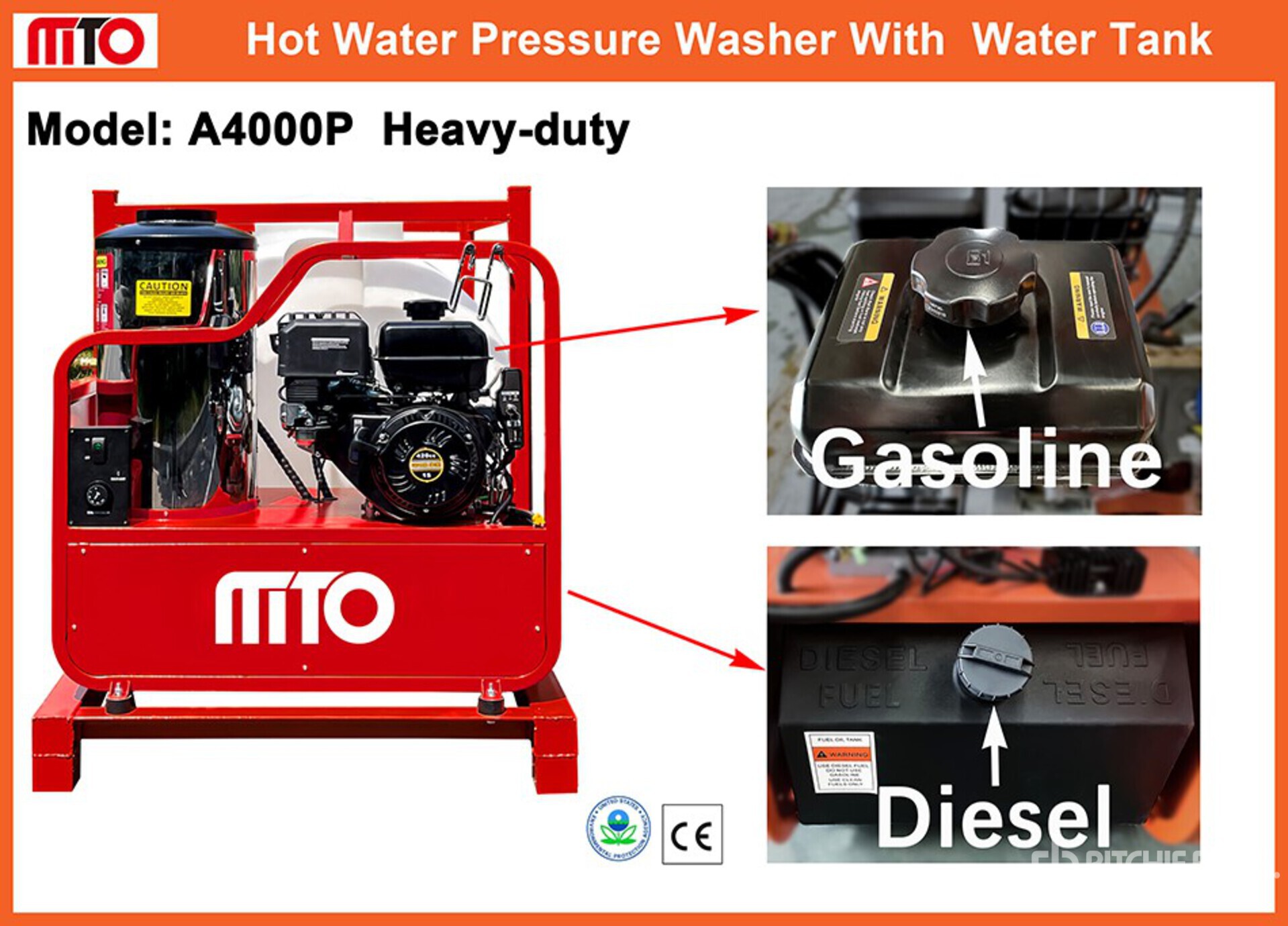 Pression nominale de 4 000 psi, chauffe-eau, alimentation en eau de 250 gal, tuyau, lance de pulvérisation, moteur à essence monocylindre de 420 cm³, 4,0 gpm