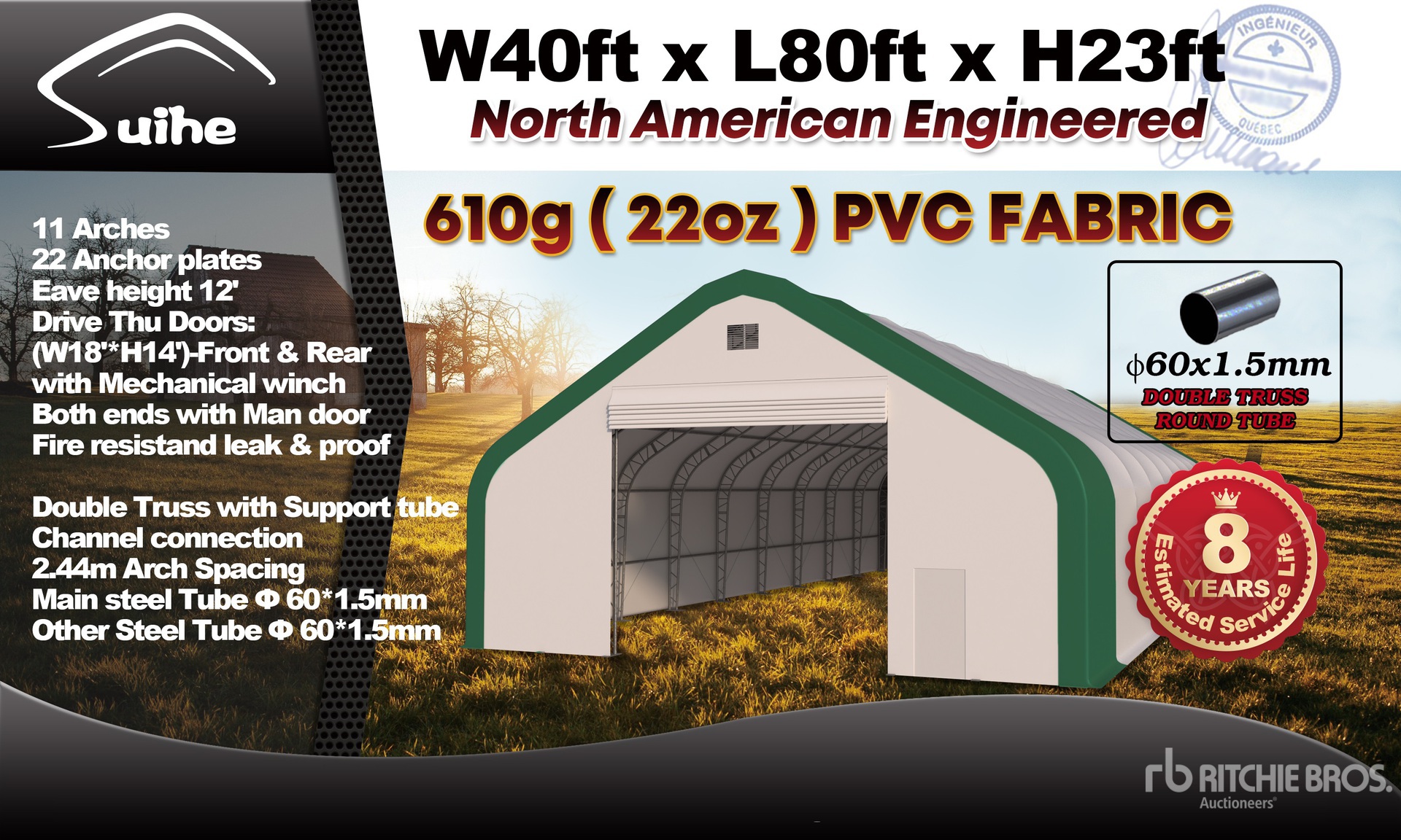 Les Informations détaillées de l’équipement sont d’une portée limitée, et les Encans Ritchie Bros. n’ont inspecté aucun autre aspect ou composant de l’équipement que ceux présentés expressément. Sauf indication précise, nous n’offrons aucune représentation ou garantie, officielle ou implicite, sur l’équipement ou ses composants, sans aucune limite de représentation ou de garantie en ce qui concerne la fonctionnalité, la conformité à toute norme de sécurité ou l’exigence de toute autorité ou agence de régulation en vigueur, l’adaptation à un quelconque usage, ou la valeur commerciale. Il vous est fortement conseillé d’effectuer votre propre inspection détaillée de l’équipement avant d’enchérir.