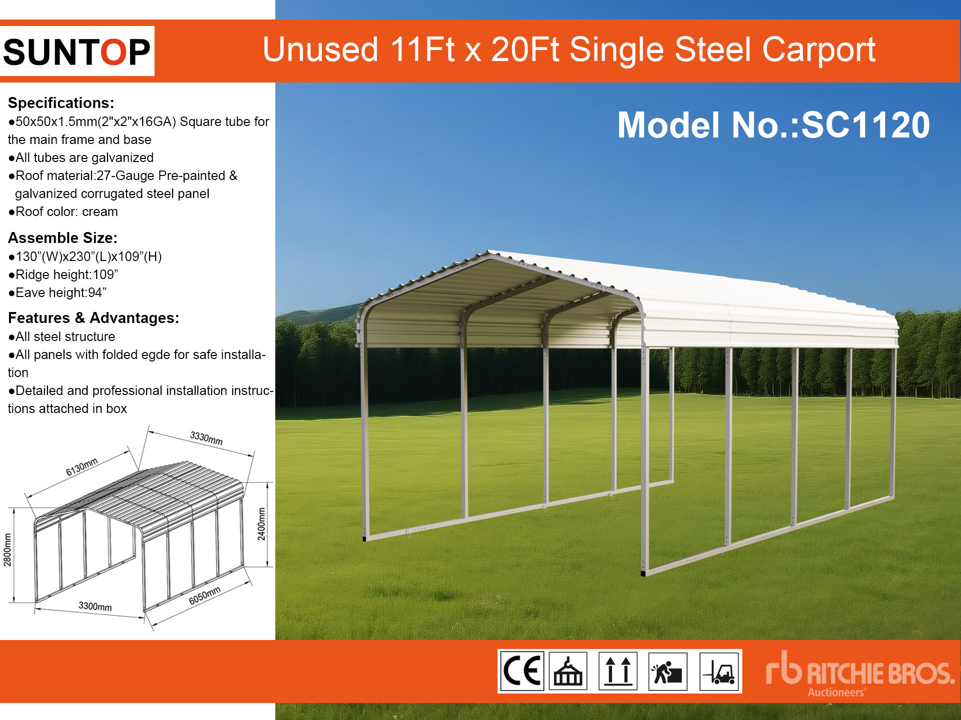 Les dimensions données ne sont qu’une estimation. Les dimensions réelles pour le chargement peuvent varier en fonction de la hauteur du camion/remorque et de la configuration/position de la machine une fois chargée. L’acheteur est responsable de la prise de mesures de toutes les charges avant de quitter le site d’enchères, et ce, afin de s’assurer que la charge peut être transportée en toute sécurité. Toutes les dimensions doivent être vérifiées par l’acheteur. Veuillez ne pas vous fier à ces dimensions pour le transport.