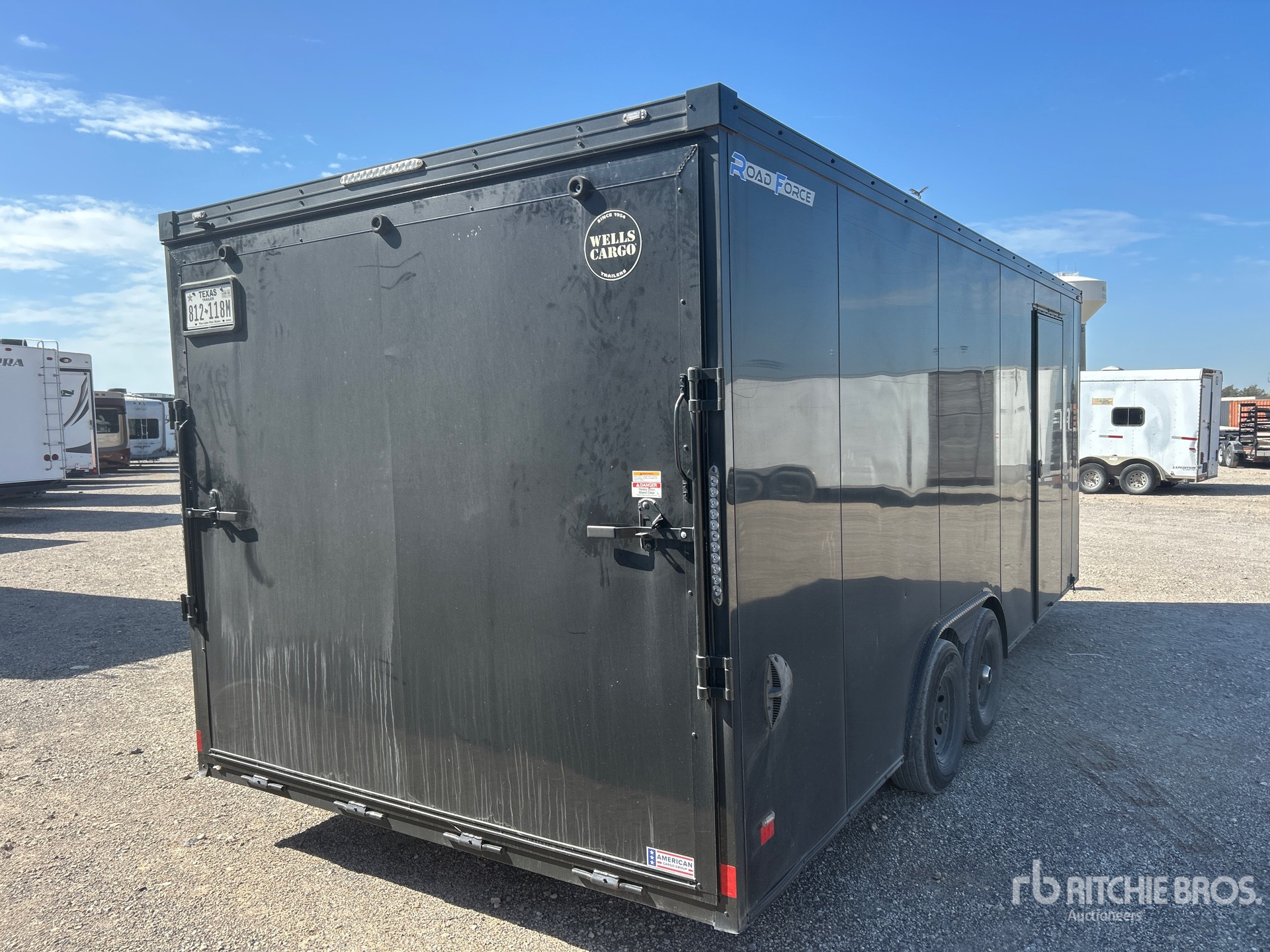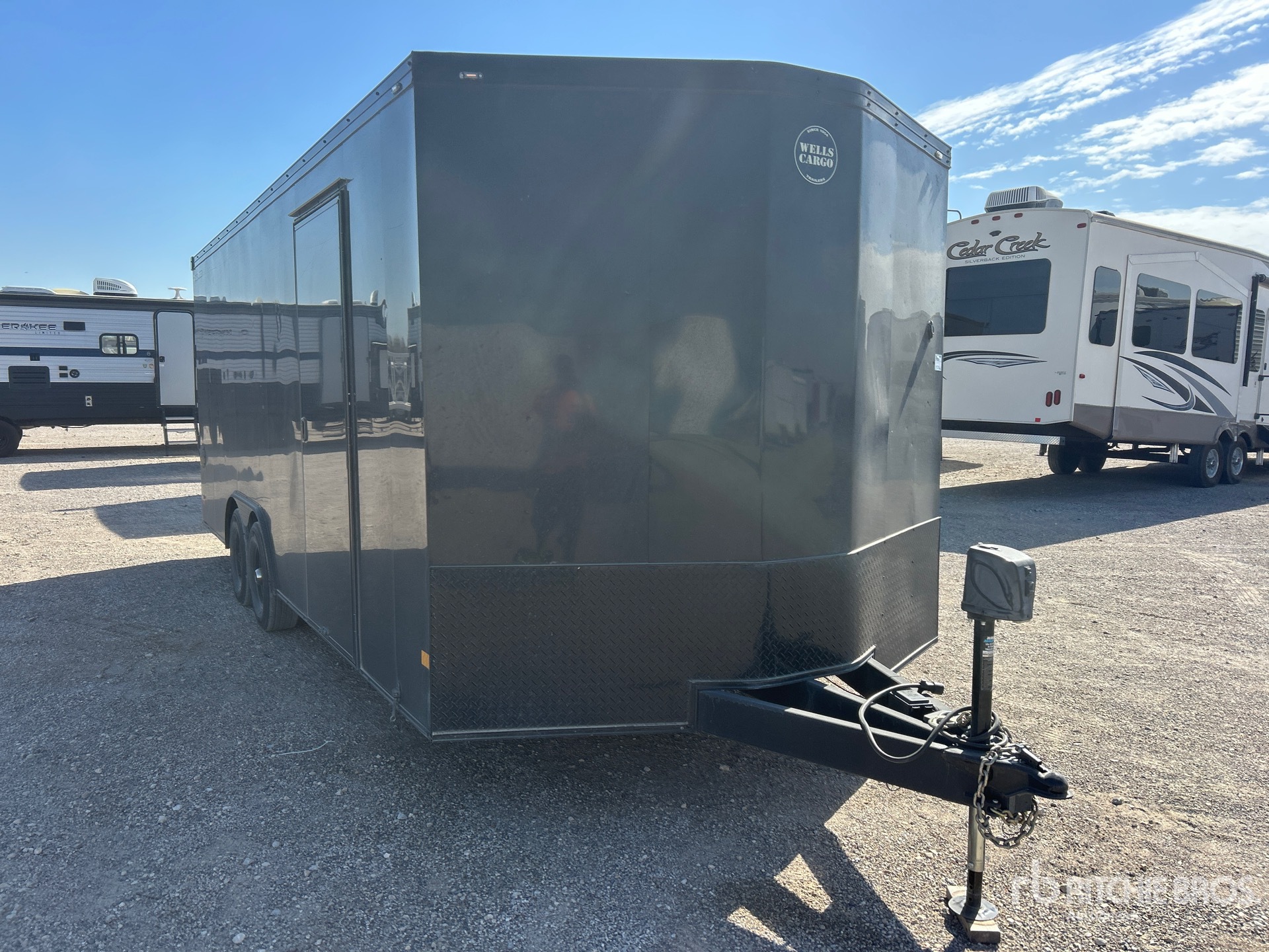 Attelage à boule, suspension à ressorts, largeur de plateau de 244 cm, largeur hors tout de 254 cm, rampe, porte latérale, pneus 225/75R15, PTAC de 4 530 kg