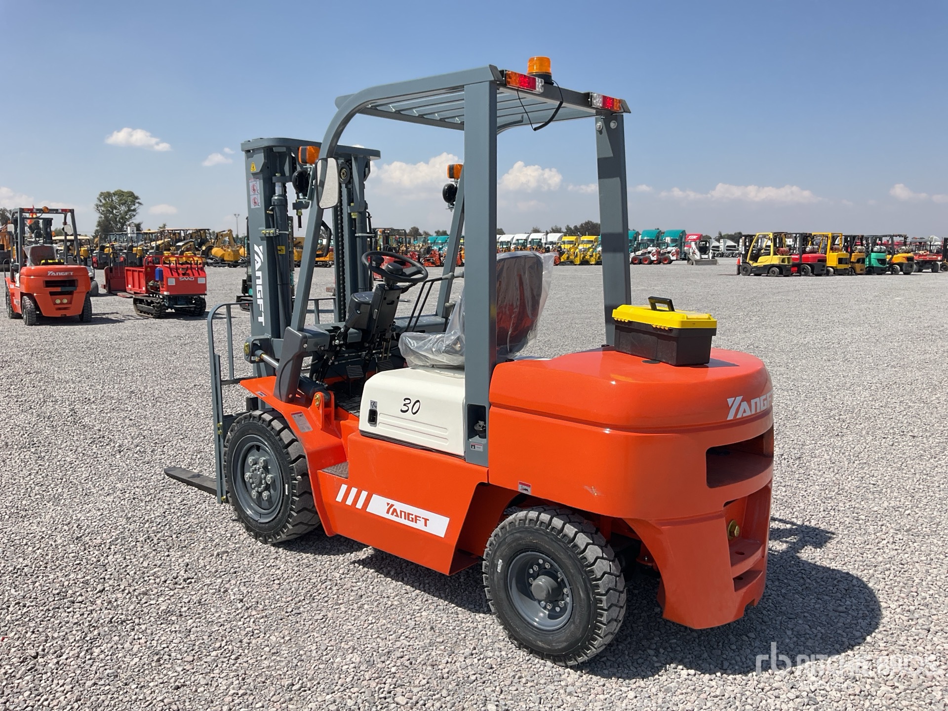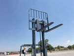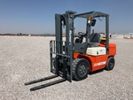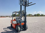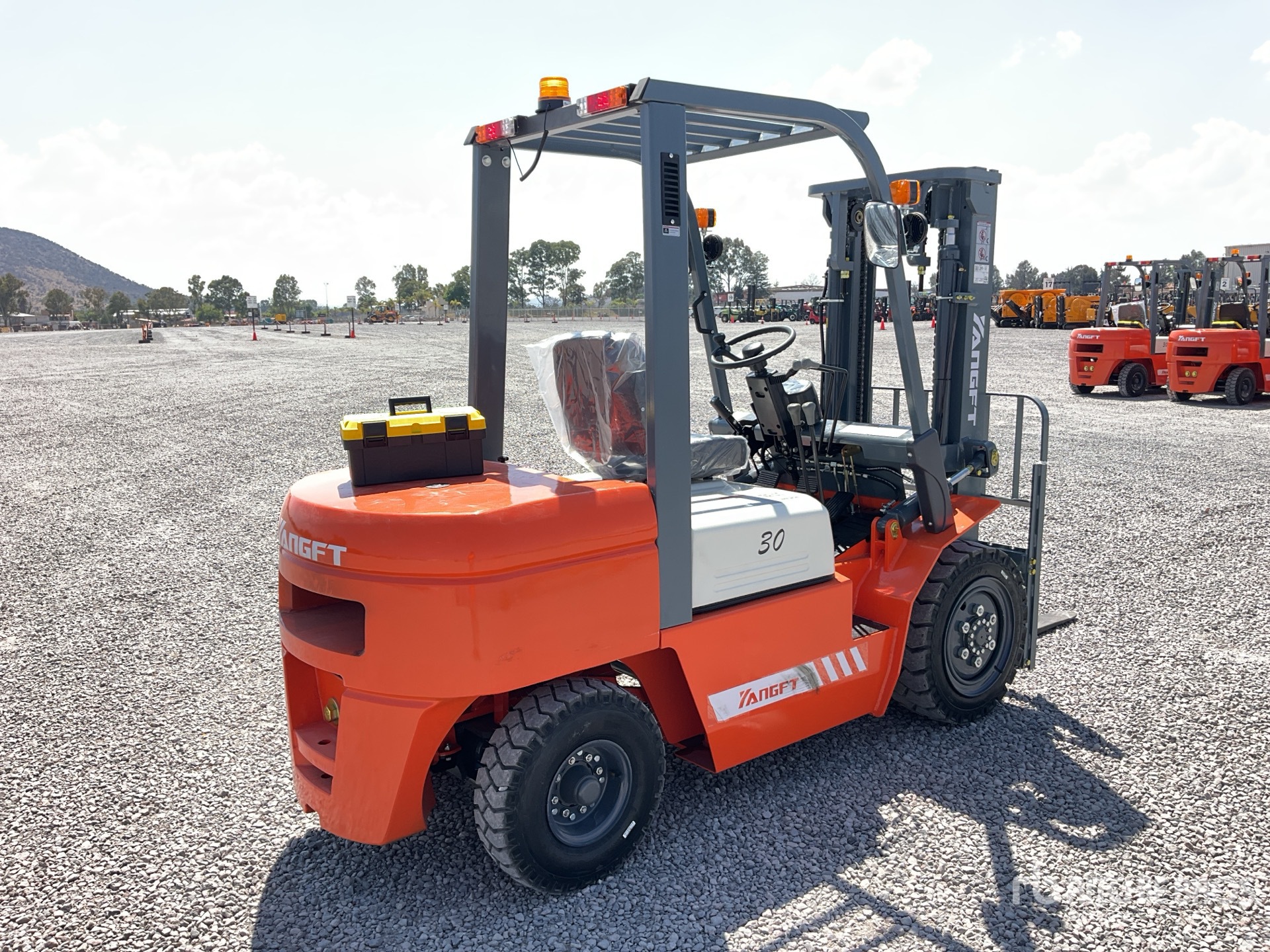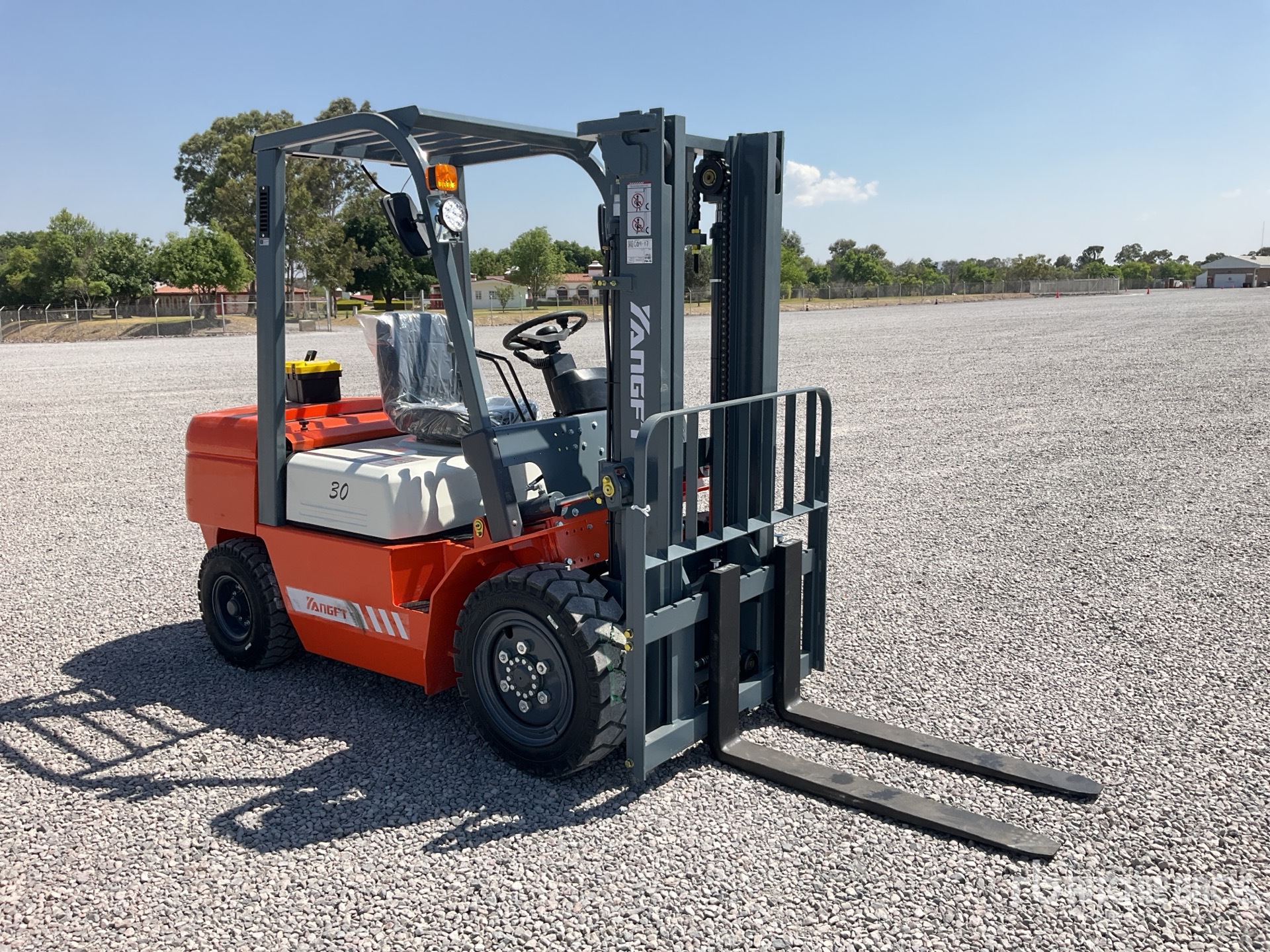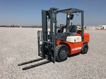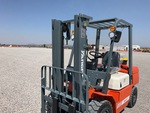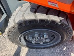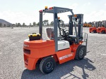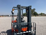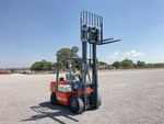 Mât à deux étages, hauteur de levage maximale de 118 po, hauteur de mât abaissée de 82 po, fourches de 42 po, pneus pleins, moteur diesel à 4 cylindres