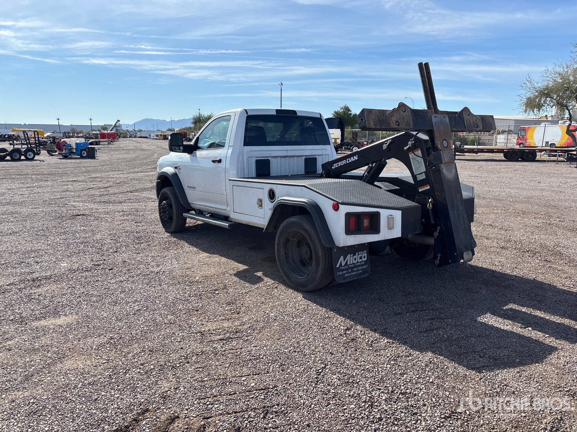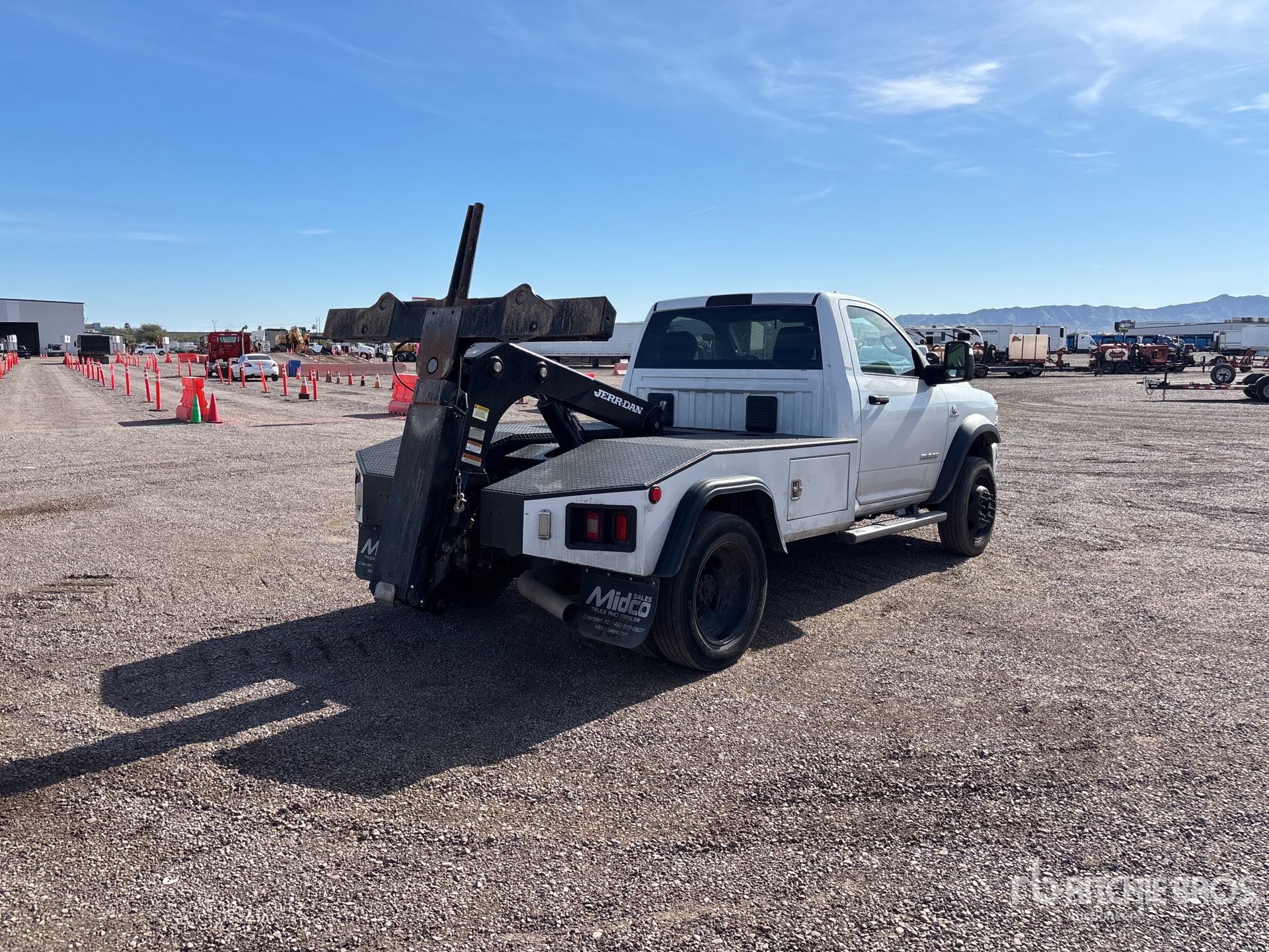 Situé sur la voie 21, emplacement 65, moteur diesel 6 cylindres 6,7 L, homologation EPA américaine 2023, nécessite un fluide d'échappement diesel, transmission automatique, essieu avant de 3175 kg, essieu arrière de 544 438 kg, PTAC de 7 483 kg, pneus 225/70R19.5, empattement de 368 cm, carrosserie de dépanneuse en acier