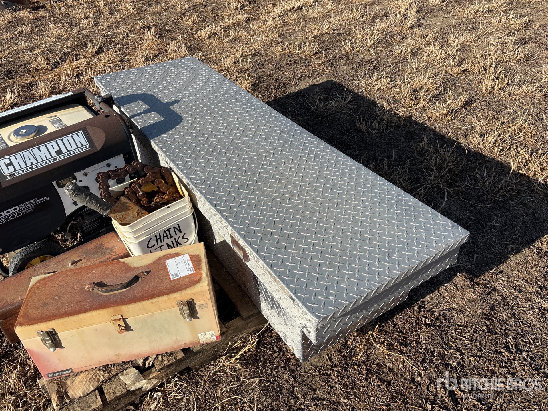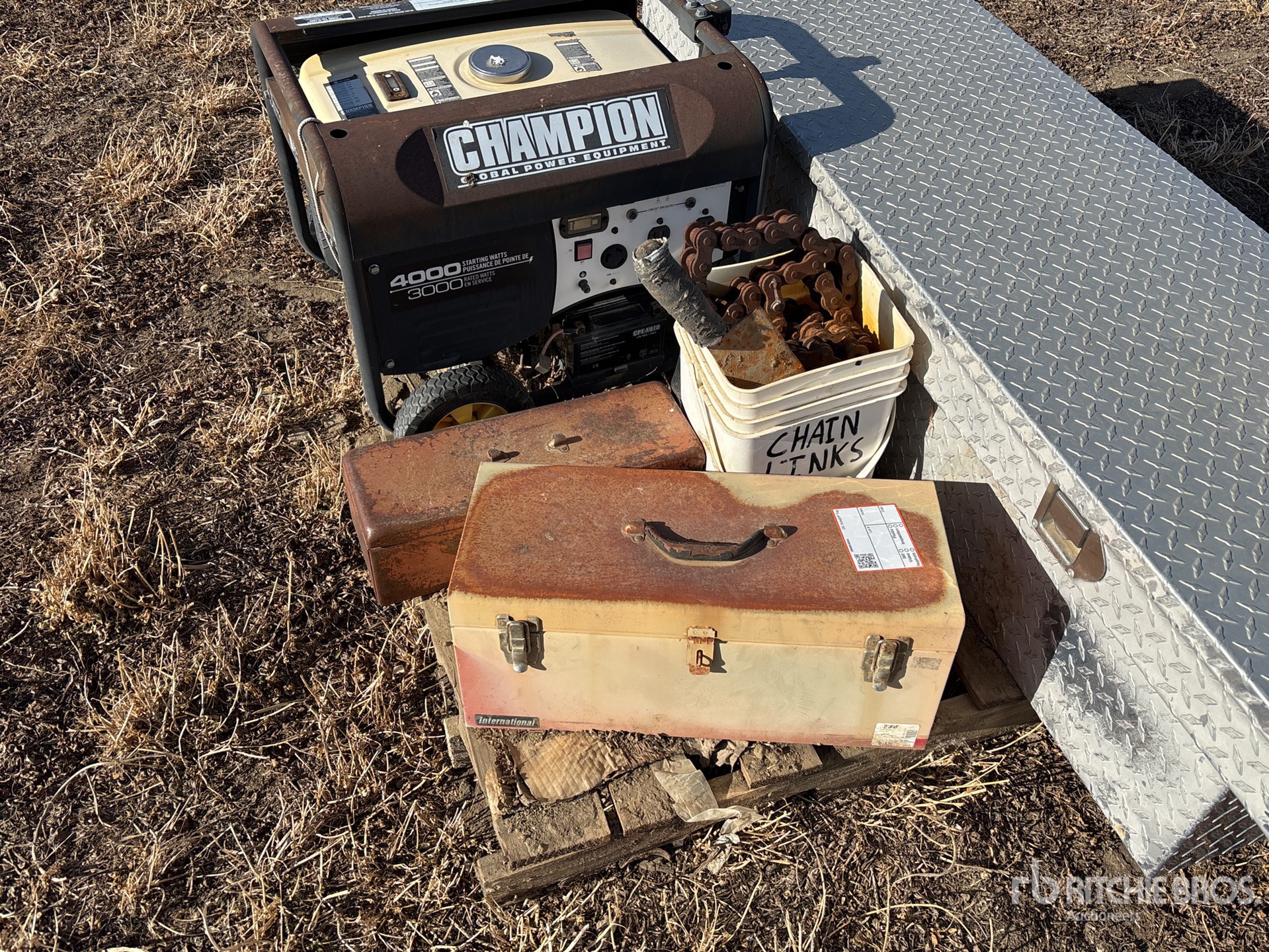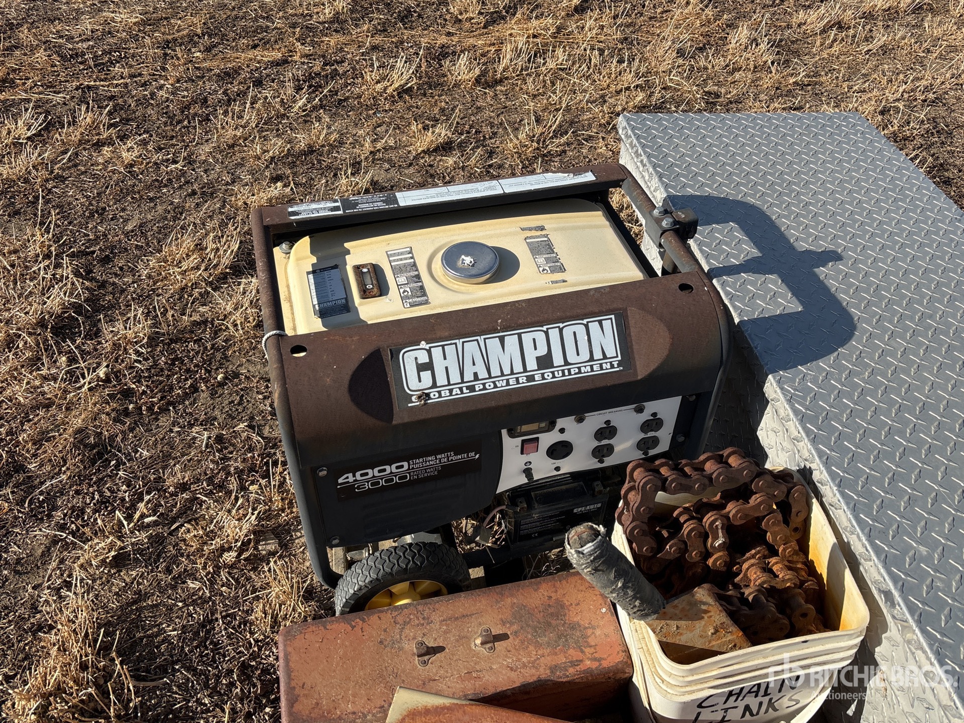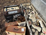 Filtres divers, générateur Champion 4000 (hors service), maillons de chaîne, boîtes à outils