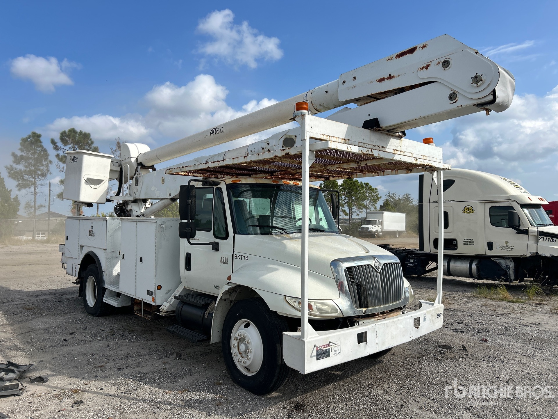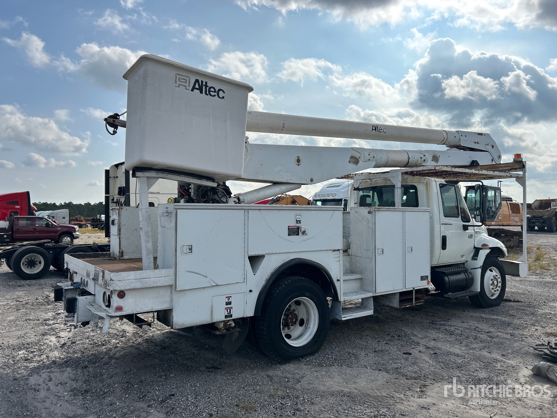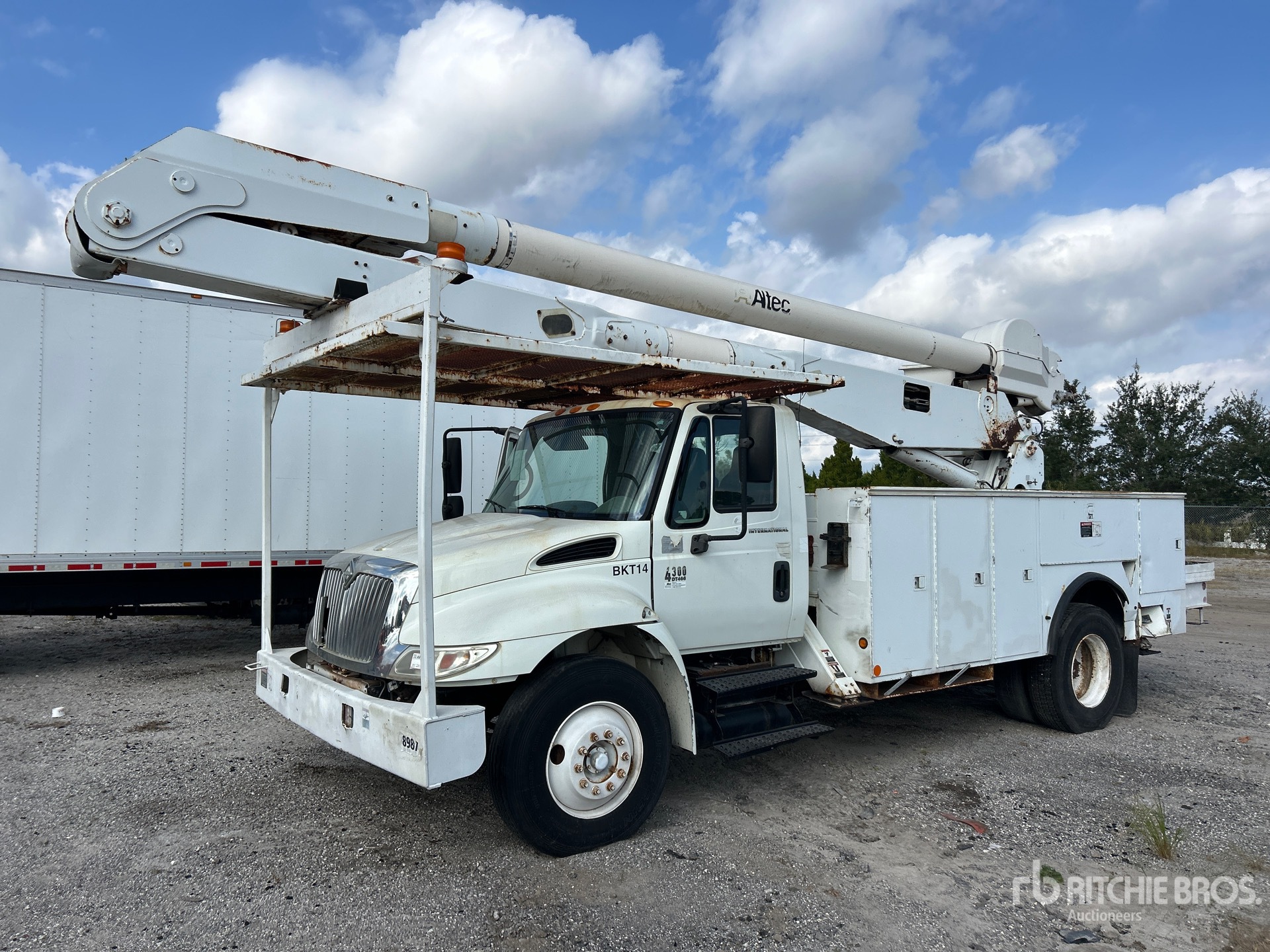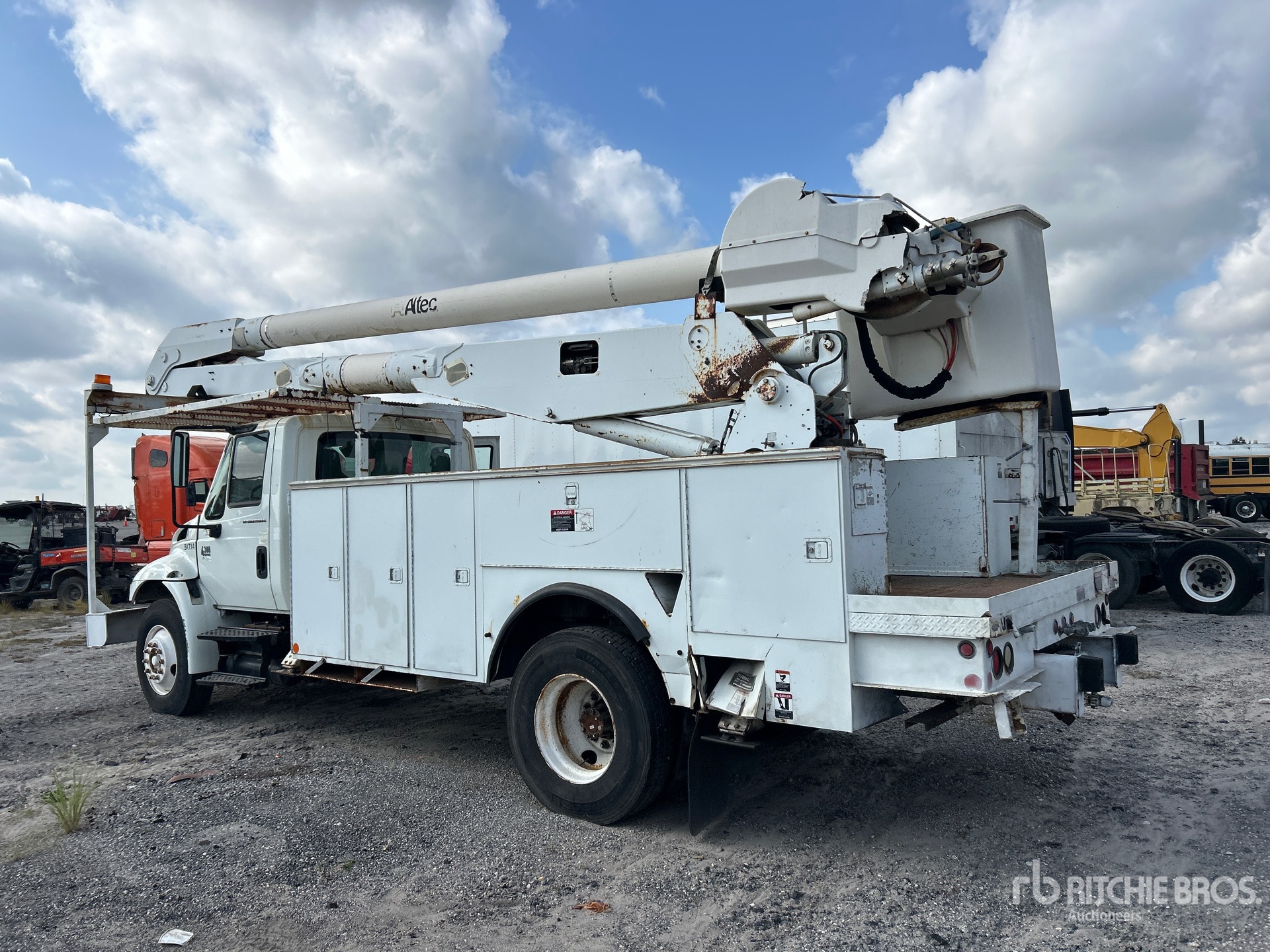 Moteur diesel International 6 cylindres 7,6 L 242 ch, homologué EPA 2006, transmission manuelle Eaton Fuller 9 vitesses, pneus 11R22.5, suspension pneumatique, empattement de 4,88 m (192 po), prise de force, capacité de levage de 227 kg (500 lb), nacelle articulée biplace montée à l'arrière, benne utilitaire, stabilisateurs latéraux.