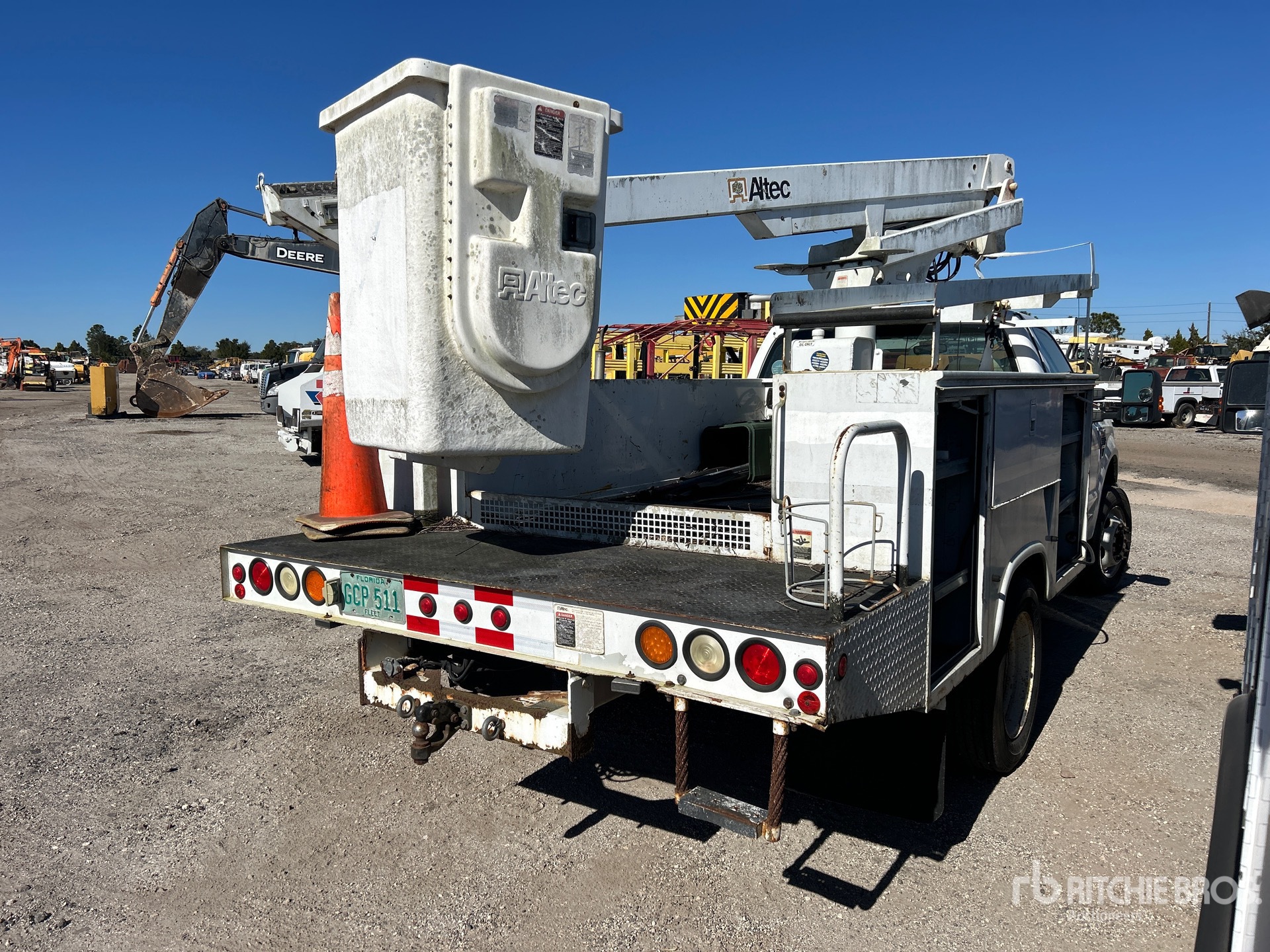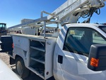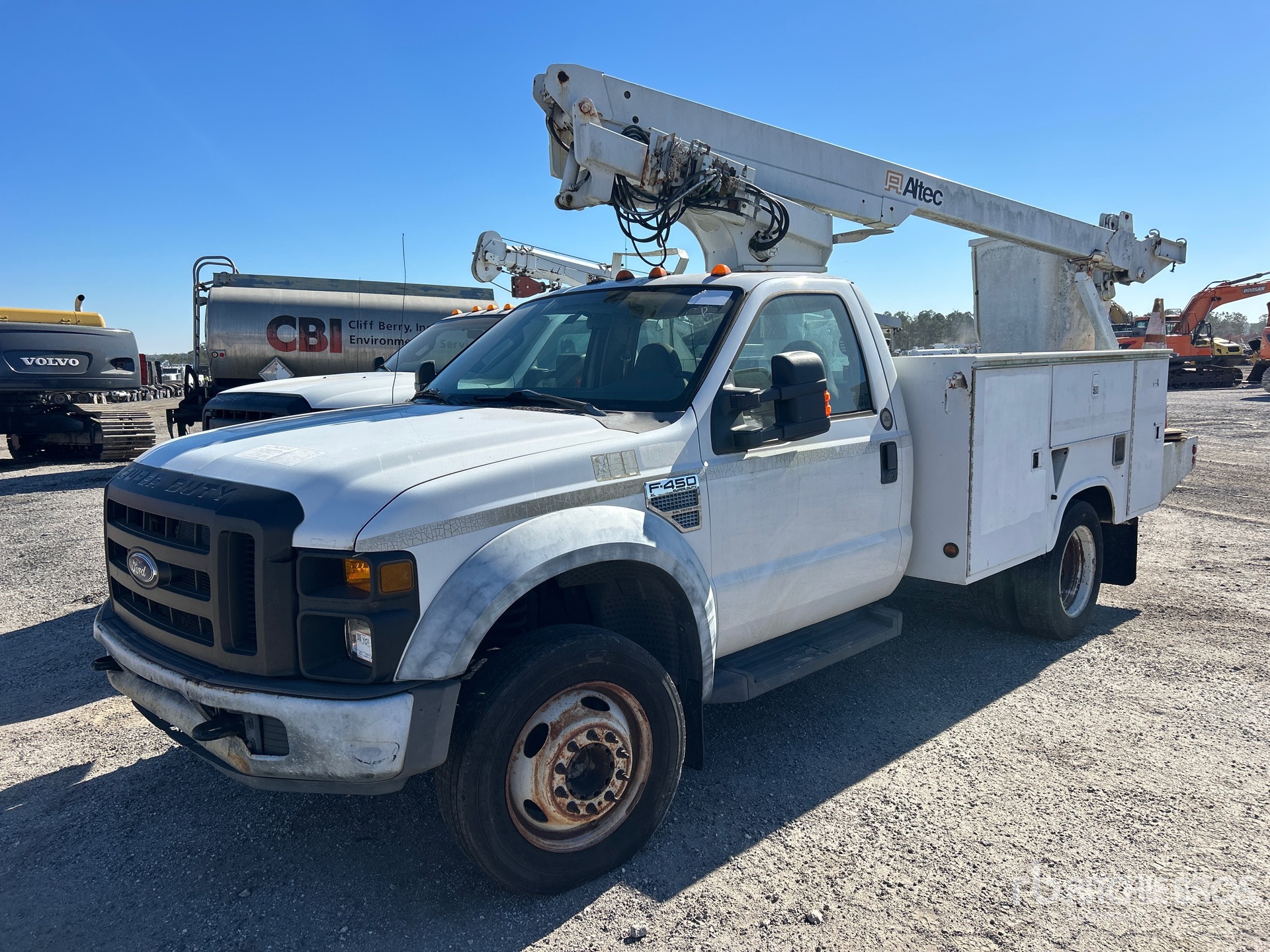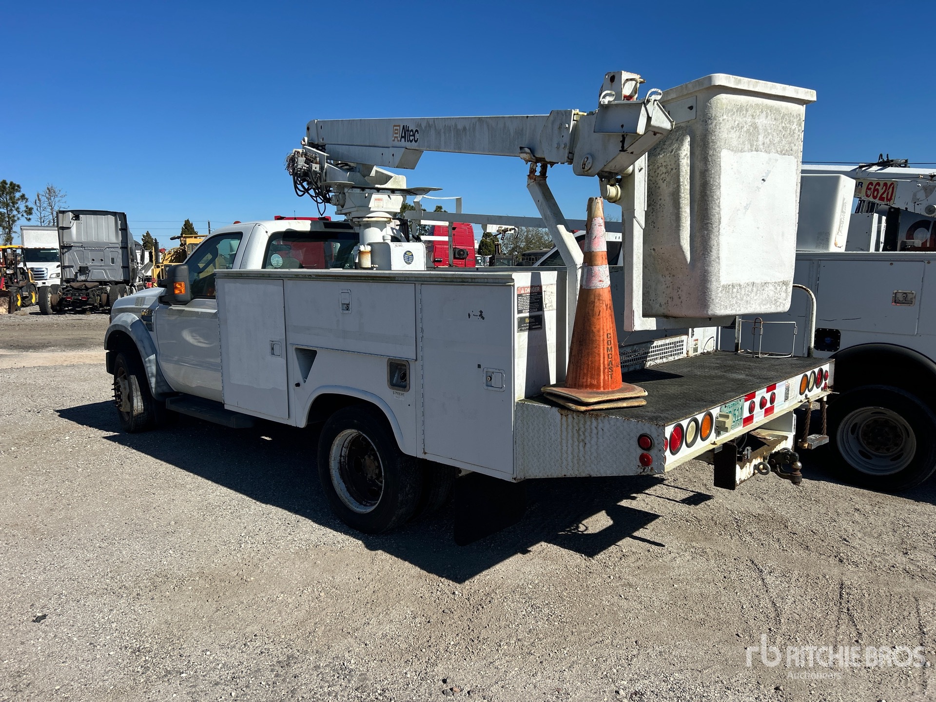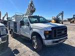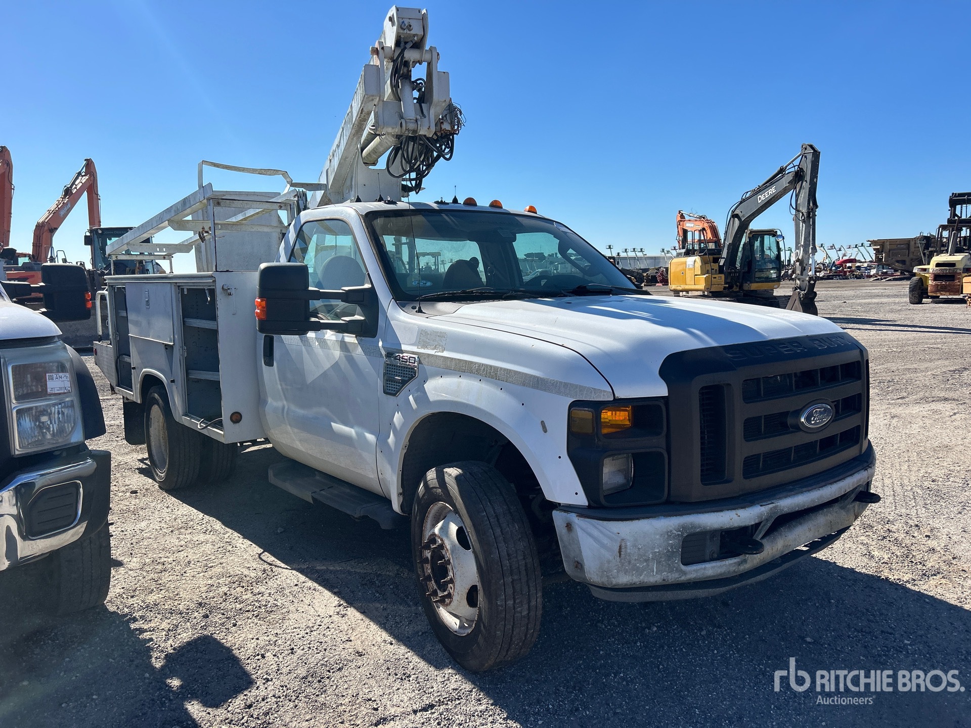 Moteur Ford V10 6,8 L à essence, homologué EPA 2008, conforme aux normes CARB, transmission automatique, essieu avant 2177 kg, essieu arrière 5443 kg, PTAC 7257 kg, pneus 225/70R19.5, suspension à ressorts, empattement 358 cm, capacité de levage 159 kg, flèche télescopique monoplace montée au centre, benne utilitaire de 3,50 m x 2,39 m, attelage à anneau