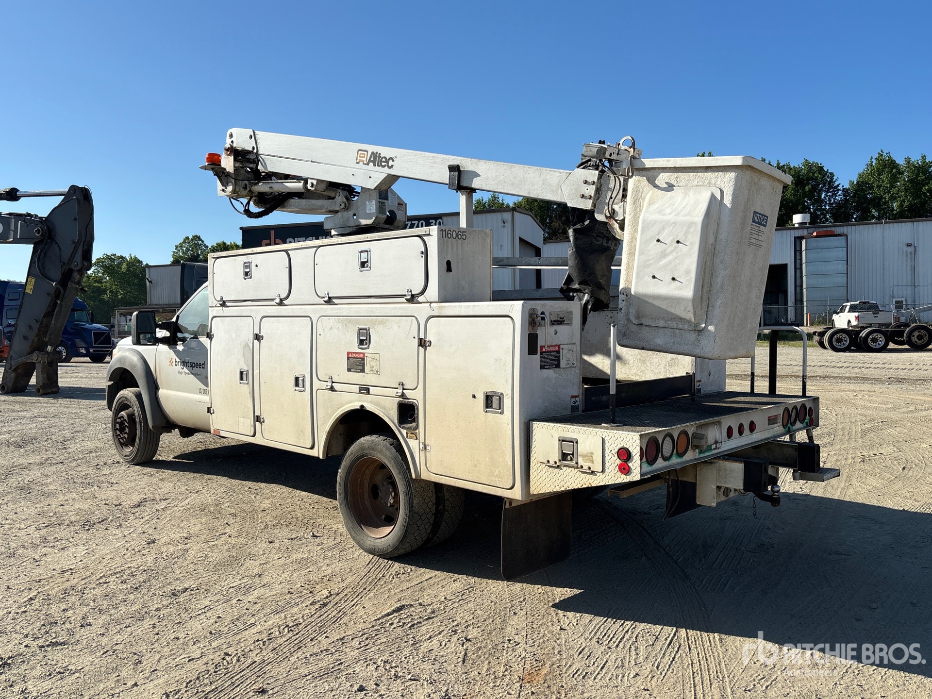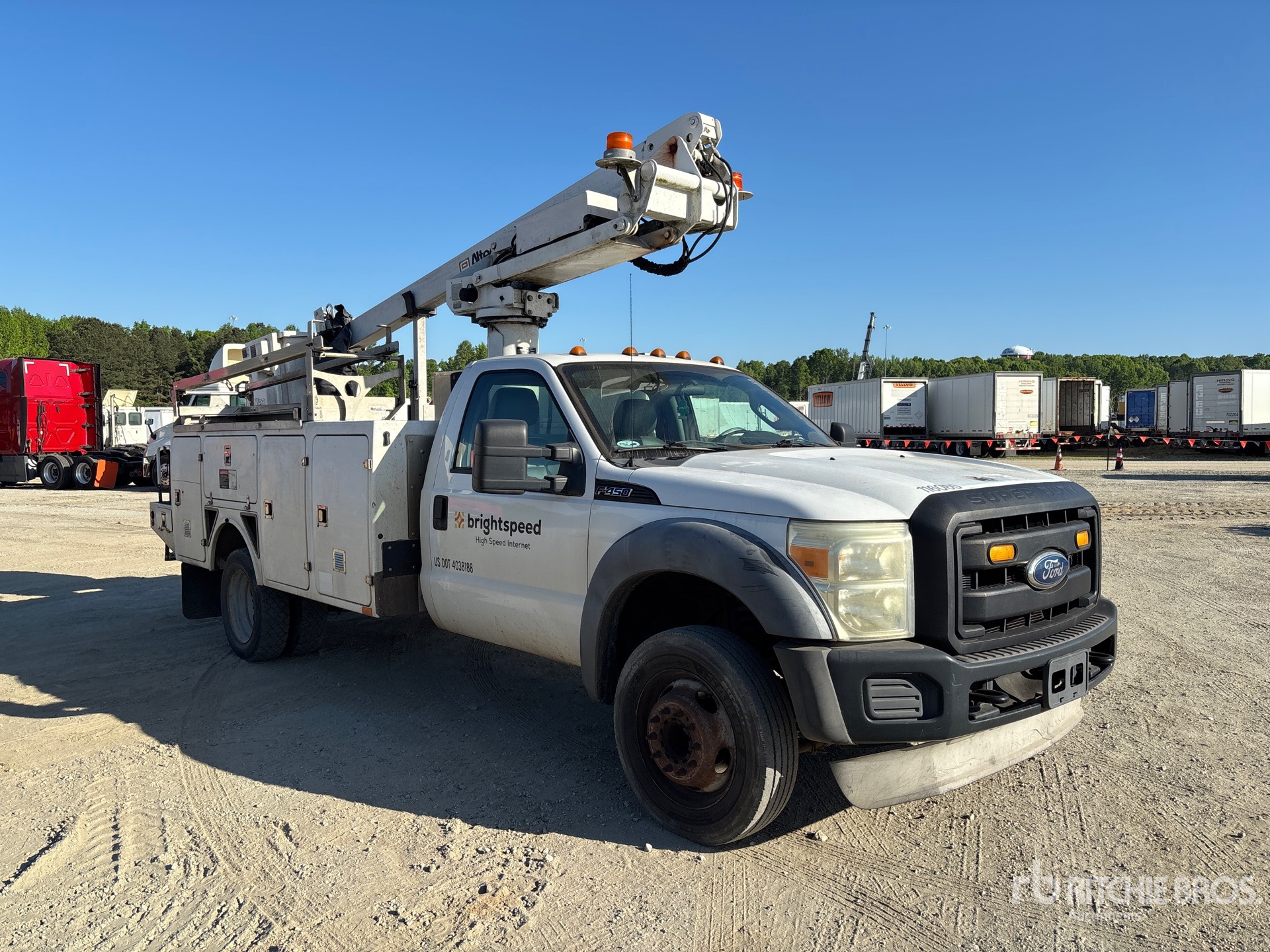 Situé sur la voie 5, emplacement 10, moteur à essence V10 6,8 L, homologué EPA 2011, transmission automatique, essieu avant 6 500 lb, essieu arrière 12 000 lb, PTAC 16 500 lb, pneus 225/70R19.5, suspension à ressorts, empattement de 165 po, prise de force, capacité de 350 lb, flèche articulée monoplace montée au centre, benne utilitaire, télécommande filaire, plateau de 11 pi x 91 po, attelage à anneau