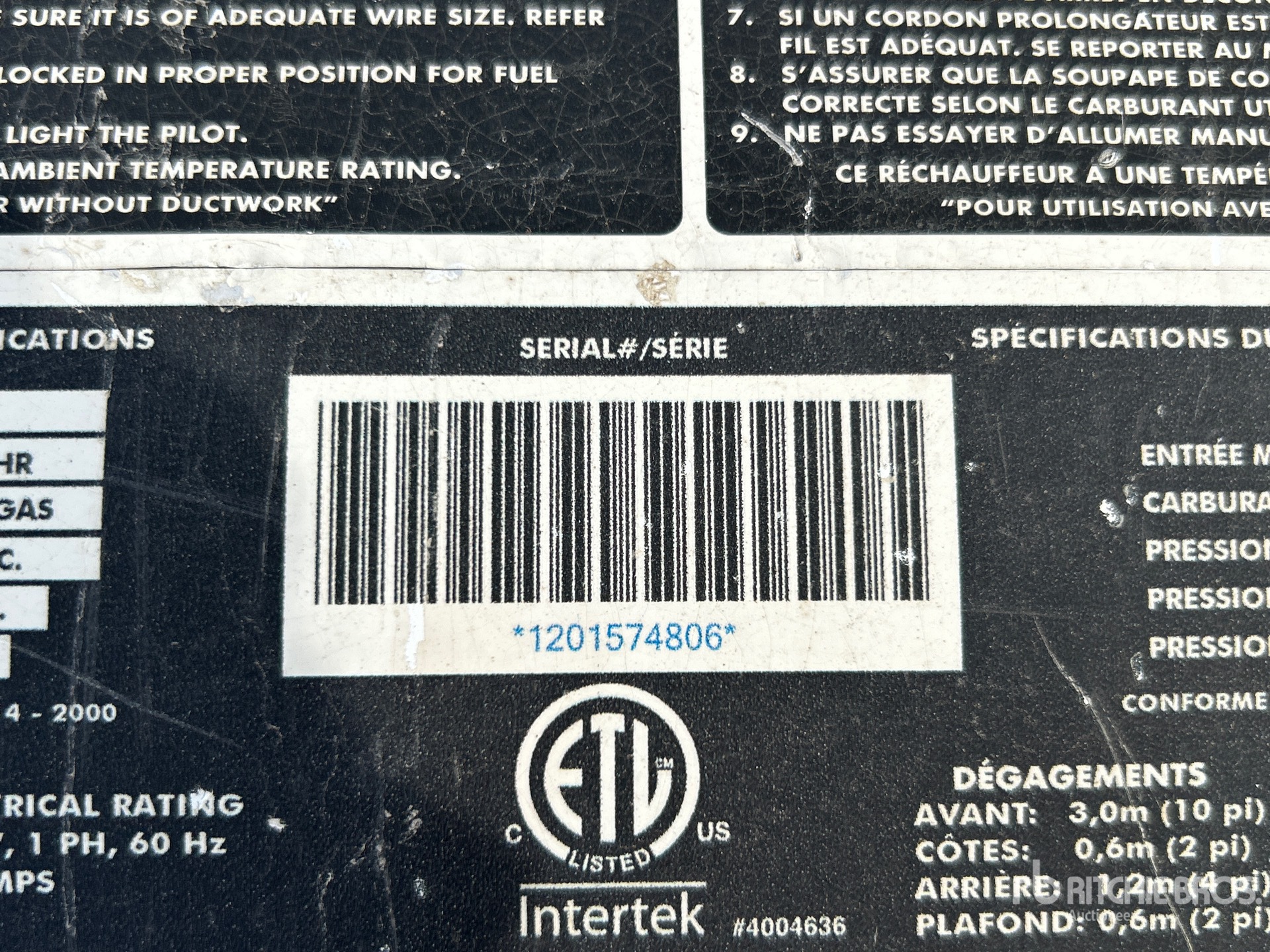 Les Informations détaillées de l’équipement sont d’une portée limitée, et les Encans Ritchie Bros. n’ont inspecté aucun autre aspect ou composant de l’équipement que ceux présentés expressément. Sauf indication précise, nous n’offrons aucune représentation ou garantie, officielle ou implicite, sur l’équipement ou ses composants, sans aucune limite de représentation ou de garantie en ce qui concerne la fonctionnalité, la conformité à toute norme de sécurité ou l’exigence de toute autorité ou agence de régulation en vigueur, l’adaptation à un quelconque usage, ou la valeur commerciale. Il vous est fortement conseillé d’effectuer votre propre inspection détaillée de l’équipement avant d’enchérir.