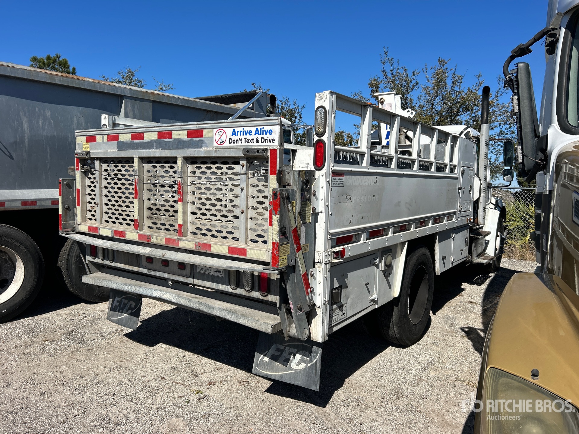 Moteur diesel Cummins ISB 6 cylindres 6,7 L 240 ch, homologué EPA 2015, nécessite un additif pour réservoirs de diesel, 15 064 heures de fonctionnement, frein moteur, transmission automatique Allison 1000, essieu avant de 3 629 kg, essieu arrière de 5 670 kg, PTAC de 8 845 kg, pneus 11R22.5, suspension à ressorts, empattement de 4 422 mm, prise de force, flèche à 2 sections de 3 à 4,9 m, stabilisateurs latéraux, plateau de 3,96 m x 2,44 m, châssis en aluminium, hayon élévateur