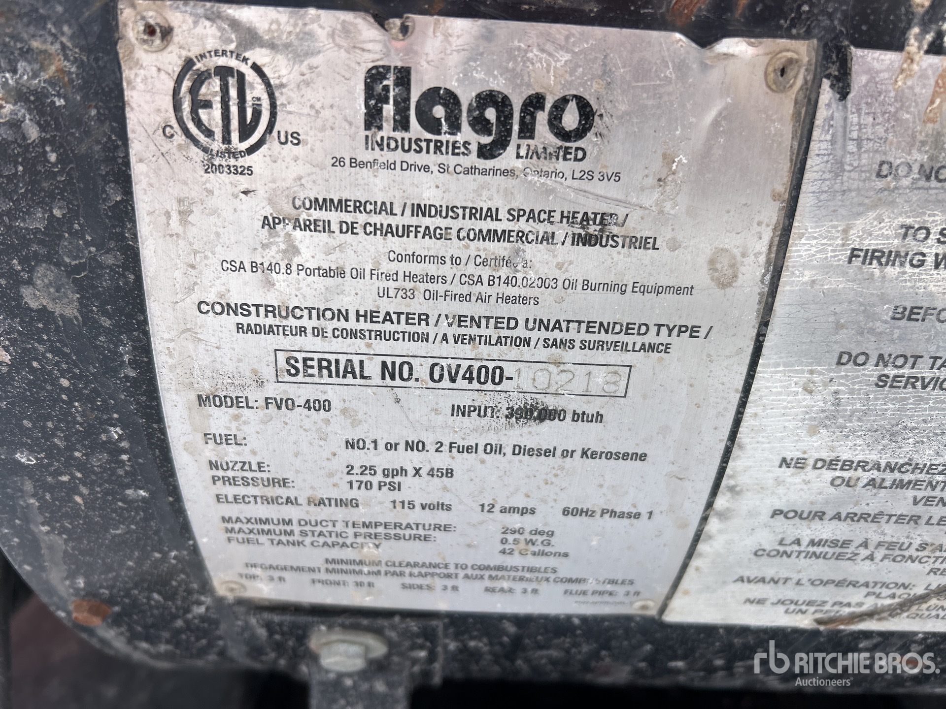 Les Informations détaillées de l’équipement sont d’une portée limitée, et les Encans Ritchie Bros. n’ont inspecté aucun autre aspect ou composant de l’équipement que ceux présentés expressément. Sauf indication précise, nous n’offrons aucune représentation ou garantie, officielle ou implicite, sur l’équipement ou ses composants, sans aucune limite de représentation ou de garantie en ce qui concerne la fonctionnalité, la conformité à toute norme de sécurité ou l’exigence de toute autorité ou agence de régulation en vigueur, l’adaptation à un quelconque usage, ou la valeur commerciale. Il vous est fortement conseillé d’effectuer votre propre inspection détaillée de l’équipement avant d’enchérir.