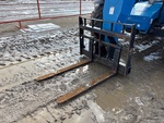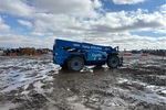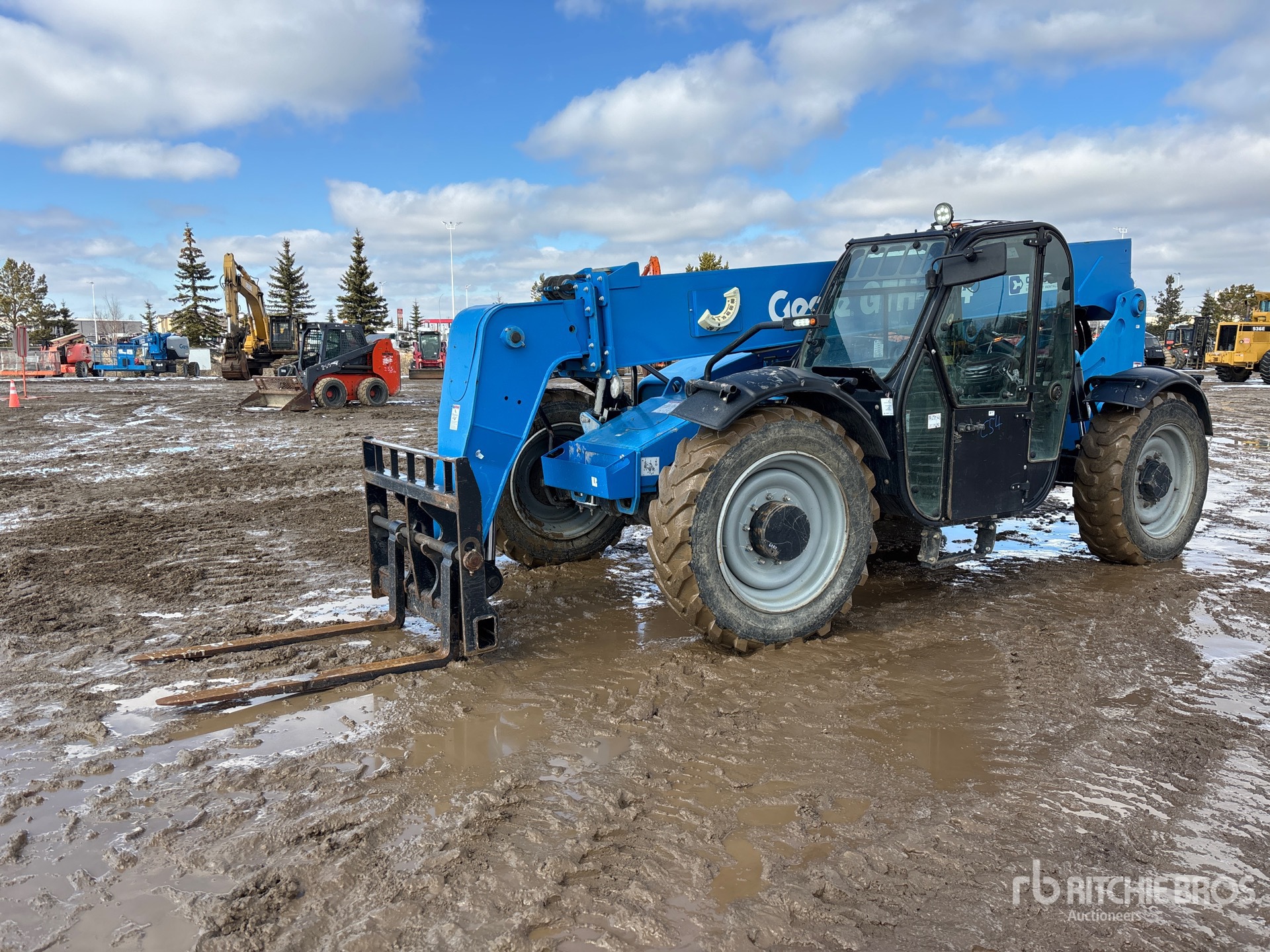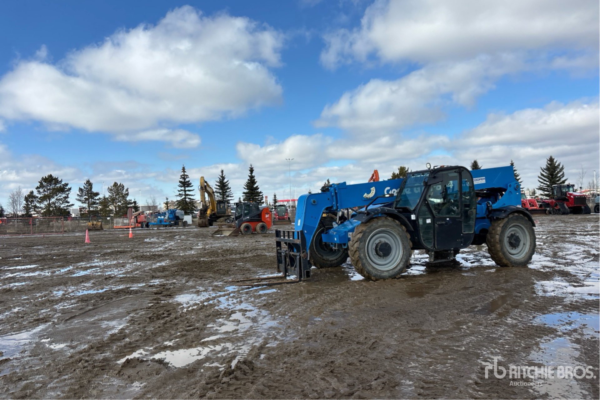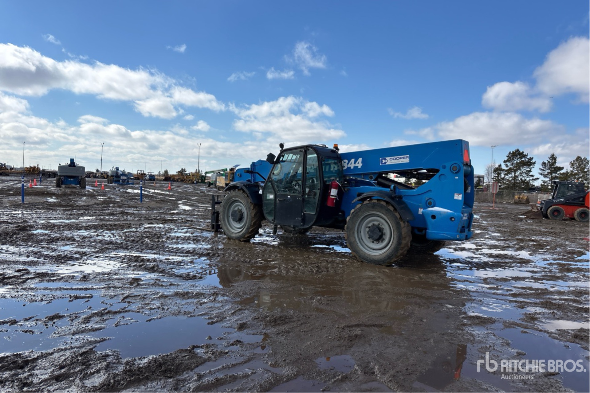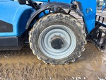 Cabine fermée, climatisation, siège à suspension pneumatique, hauteur de levage maximale de 13,7 m, capacité de levage maximale de 3 629 kg, fourches de 122 cm, attelage manuel, circuit hydraulique auxiliaire, pneus 330/85-28