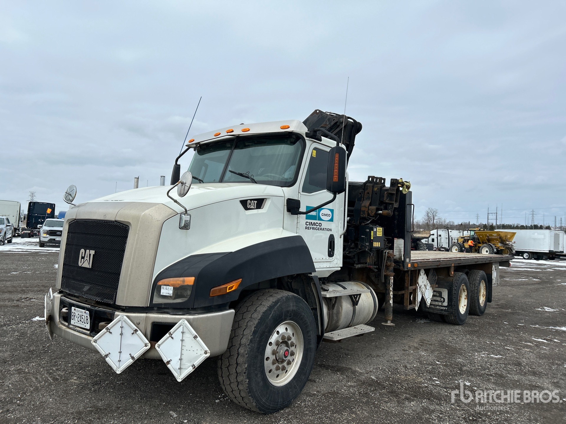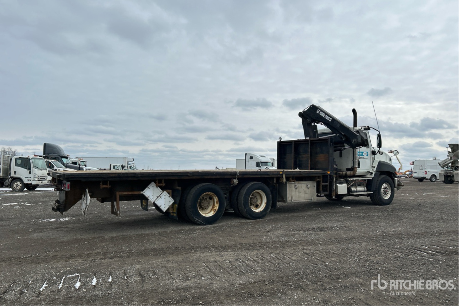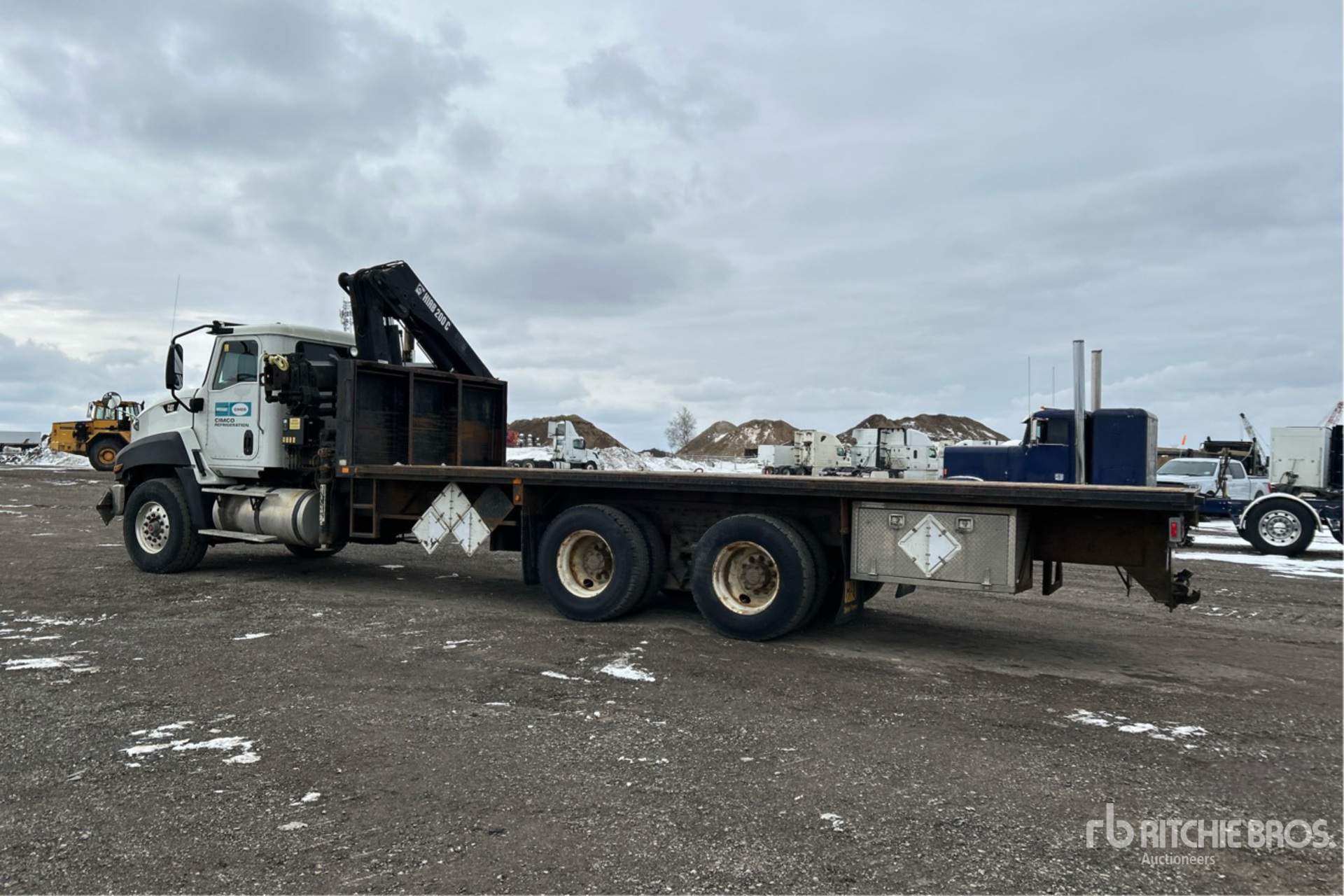 Moteur diesel Cat MaxxForce 11, 6 cylindres, 10,5 L, 370 ch, homologué EPA (États-Unis) 2012, conforme aux normes CARB, 10 878 heures moteur, frein moteur, boîte de vitesses manuelle Eaton Fuller à 10 rapports, double blocage de différentiel, essieu avant de 9 072 kg, essieu arrière de 20 864 kg, PTAC de 29 946 kg, pneus avant 425/65R22.5, pneus arrière 11R22.5, double direction, suspension Hendrickson Haulmaax à balancier en caoutchouc, empattement de 4 011 mm, prise de force, flèche à 5 sections, stabilisateurs déployables et repliables, télécommandes avec et sans fil, benne de 7,57 m x 2,46 m