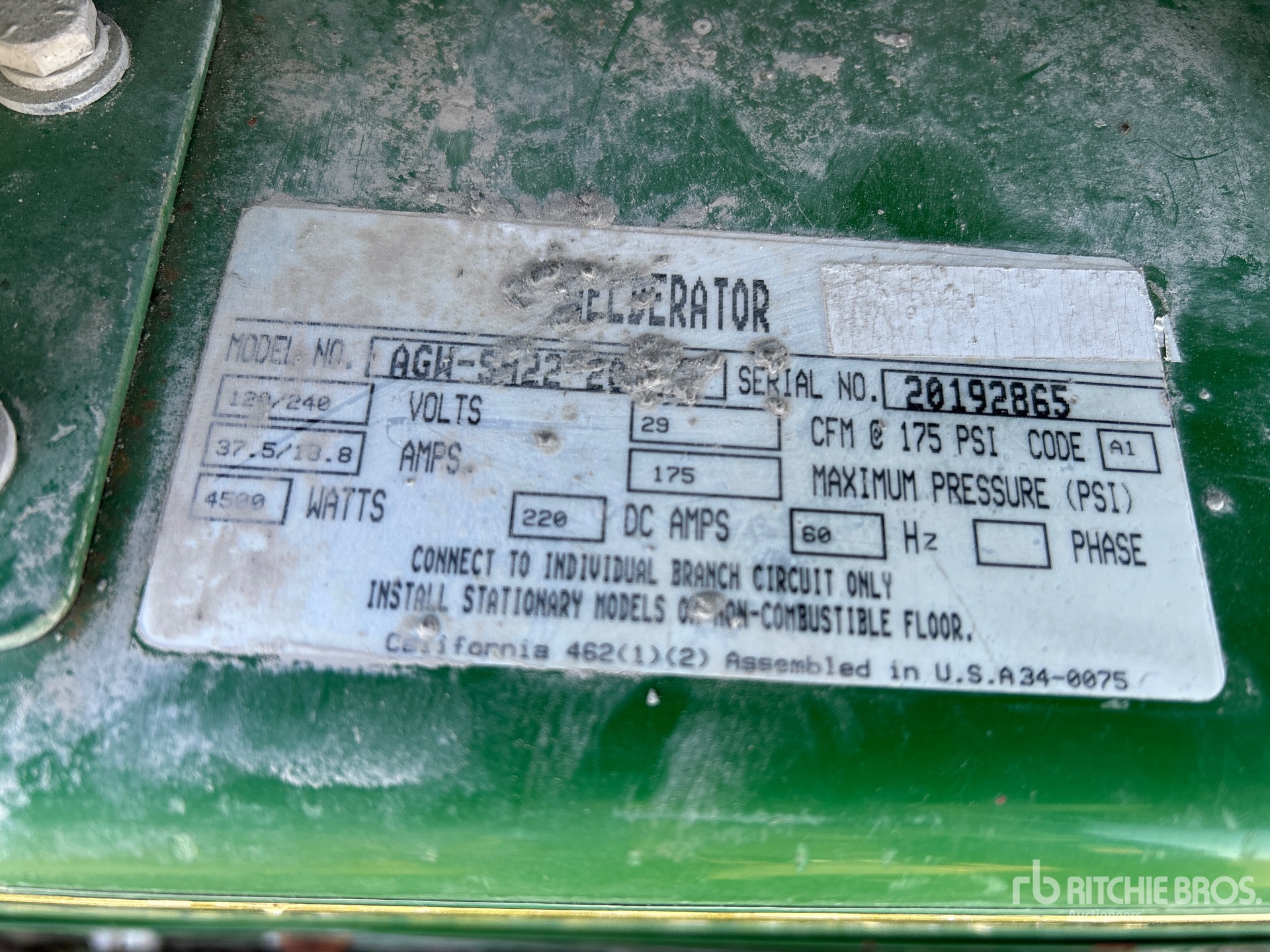 Étiquette EPA américaine 2014, moteur à essence Honda 2 cylindres, puissance nominale monophasé de 4,5 kW, tension nominale 120 V/240 V, compresseur d'air 29 pm 175 psi