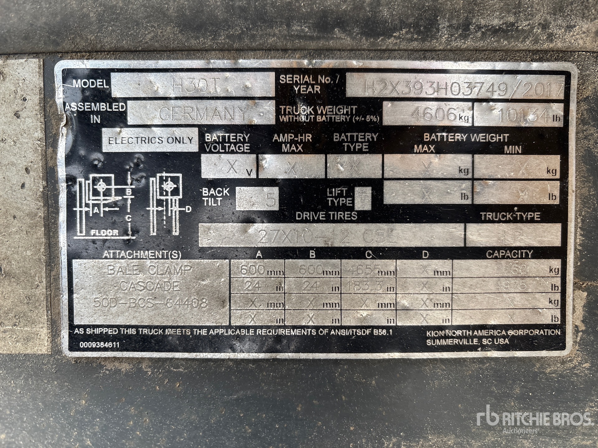 Les Informations détaillées de l’équipement sont d’une portée limitée, et les Encans Ritchie Bros. n’ont inspecté aucun autre aspect ou composant de l’équipement que ceux présentés expressément. Sauf indication précise, nous n’offrons aucune représentation ou garantie, officielle ou implicite, sur l’équipement ou ses composants, sans aucune limite de représentation ou de garantie en ce qui concerne la fonctionnalité, la conformité à toute norme de sécurité ou l’exigence de toute autorité ou agence de régulation en vigueur, l’adaptation à un quelconque usage, ou la valeur commerciale. Il vous est fortement conseillé d’effectuer votre propre inspection détaillée de l’équipement avant d’enchérir.