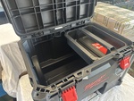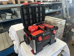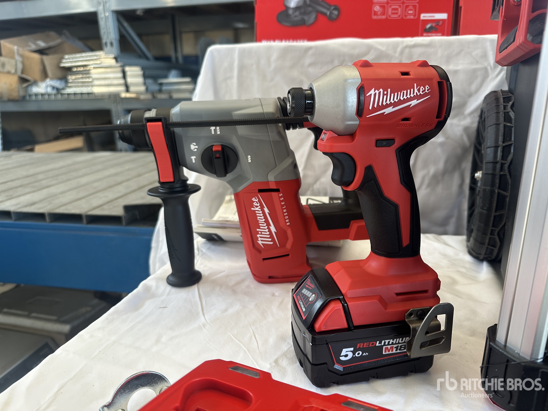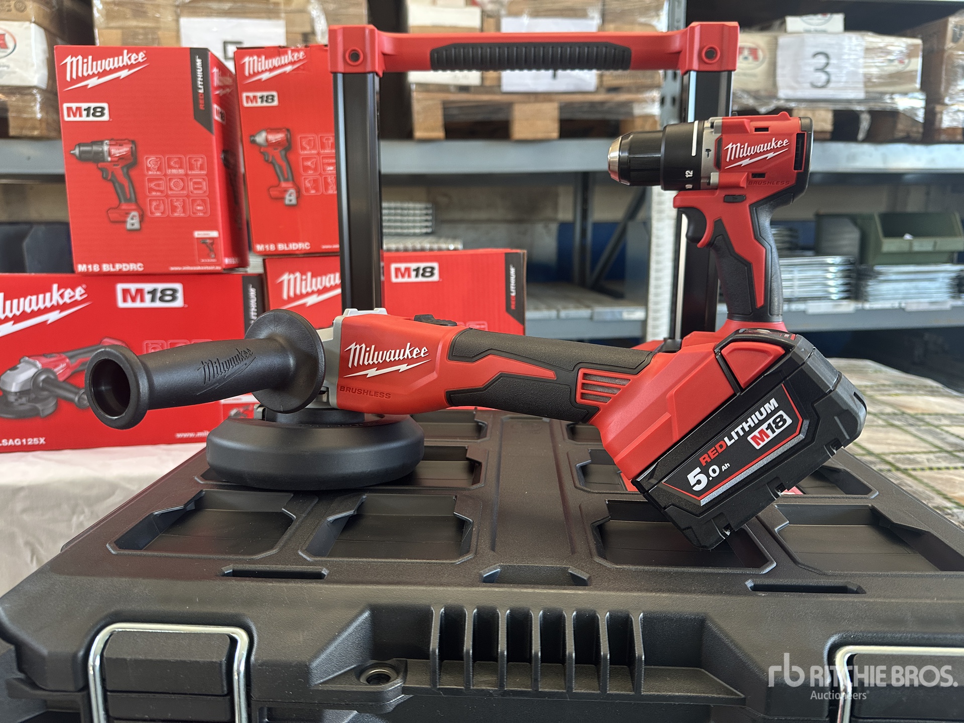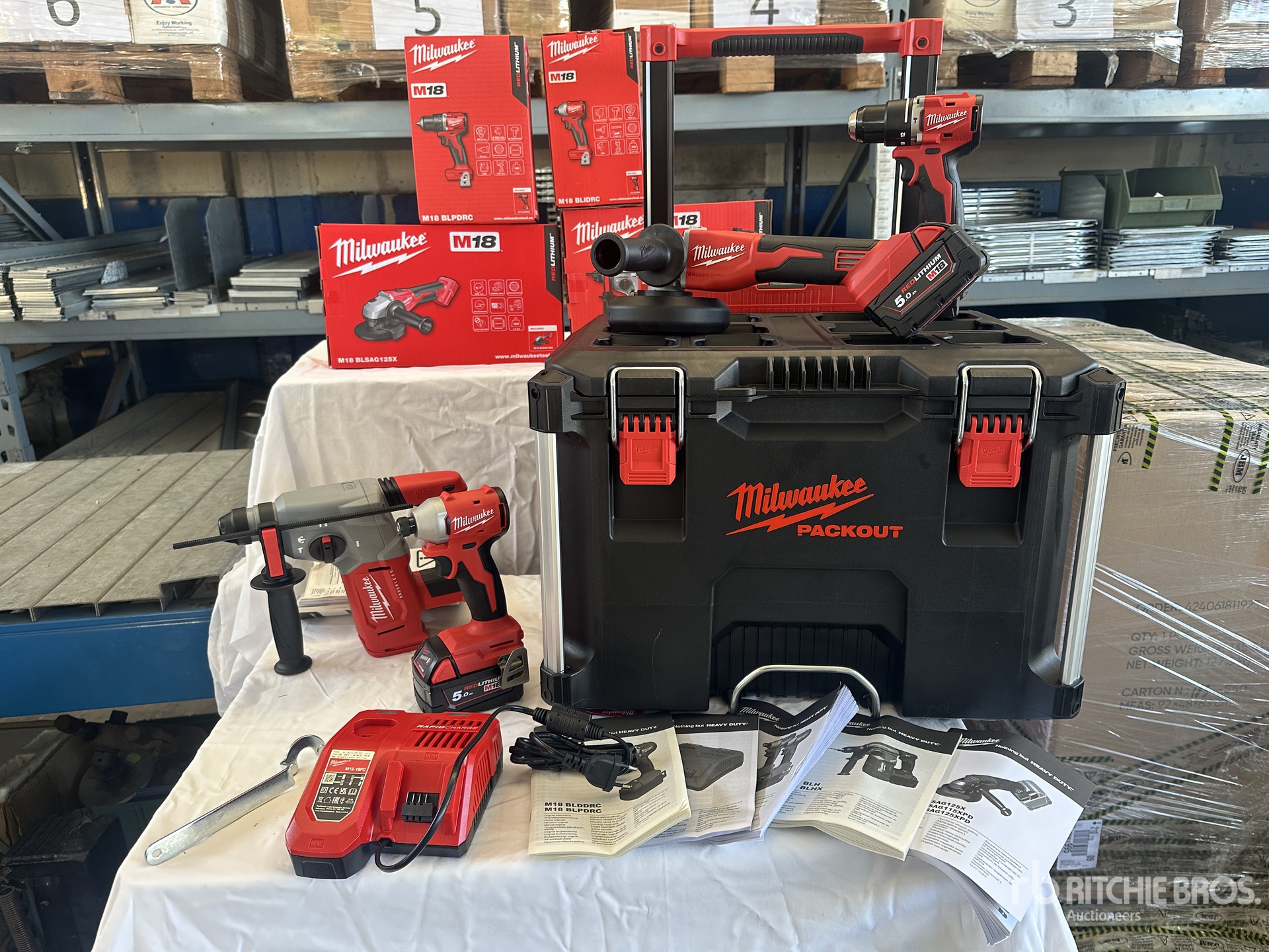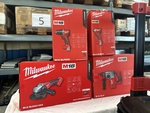 1 coupe-carreaux, 1 meuleuse, 1 visseuse à percussion, 1 perceuse-visseuse compacte, 3 batteries, 1 chargeur de batterie, 1 chariot