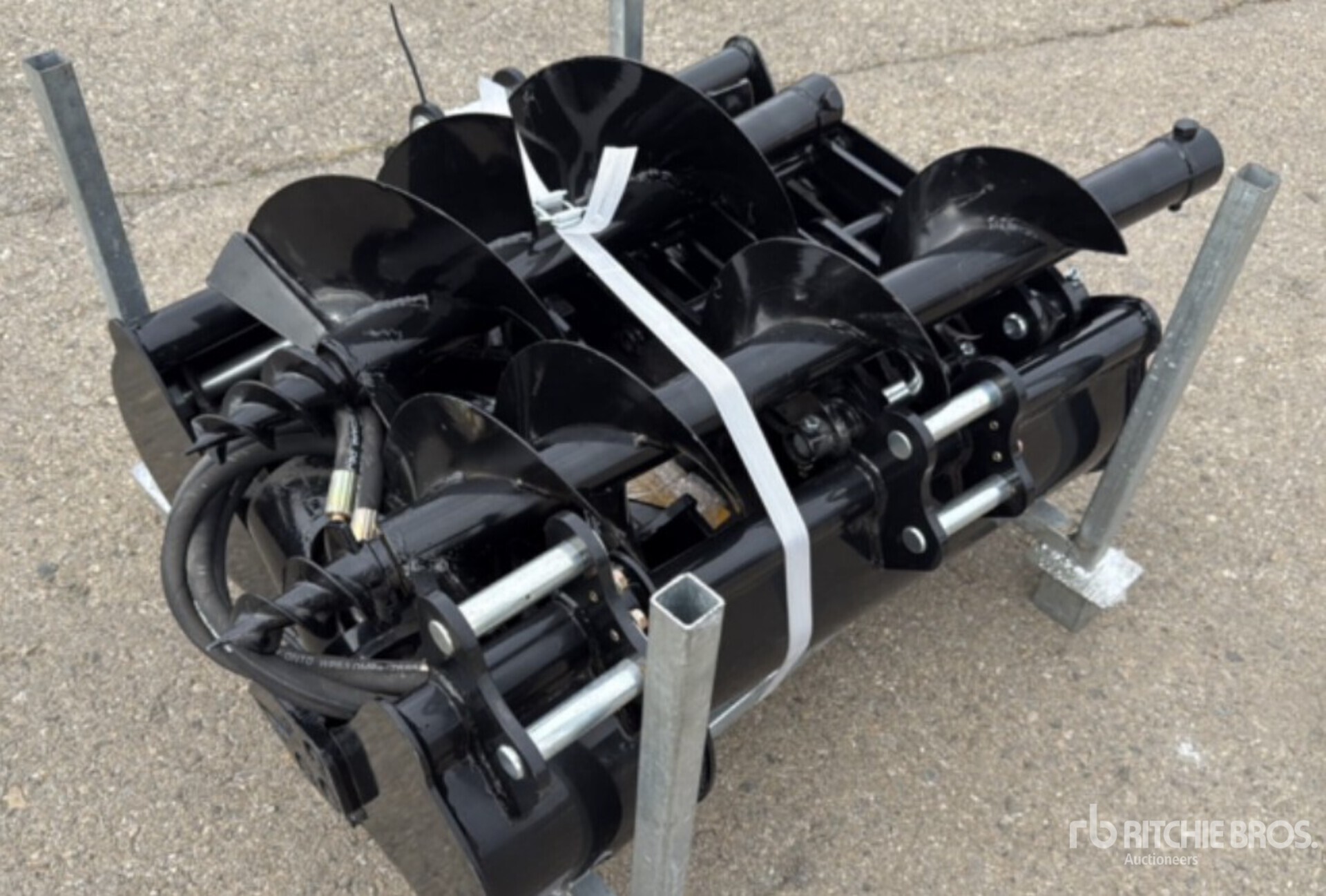 (1) Godet de 20 cm, (1) Godet de 60 cm, (1) Godet de 80 cm, (1) Tarière avec mèches de 20 cm et 30 cm, (1) Attache rapide, (1) Râteau, (1) Ripper, (1) Grappin, (1) Jeu de dents de godet avec lame latérale. Les images présentées sont des photos d'illustration. Article neuf/non utilisé.