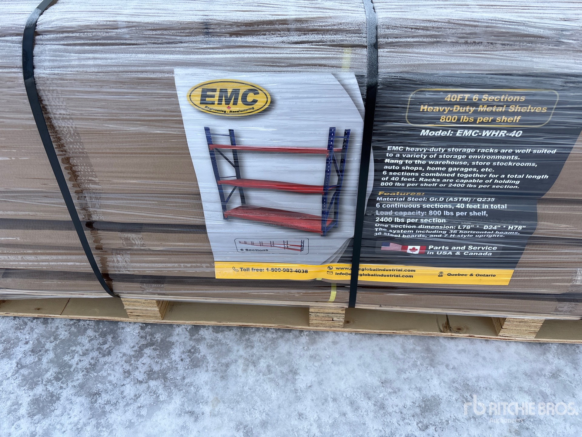 Six sections assemblées forment un ensemble d'une longueur totale de 40 pieds. Chaque étagère a une capacité de charge de 800 livres.