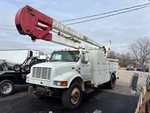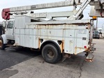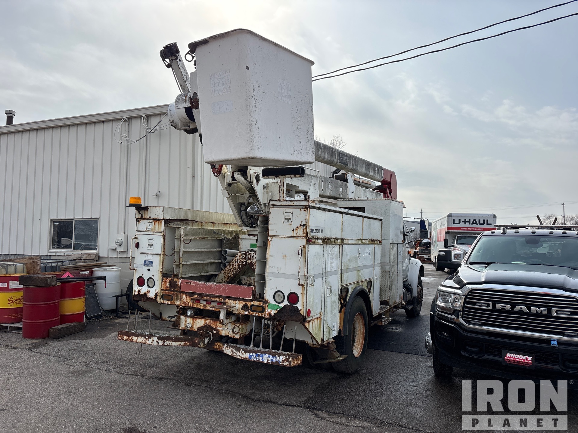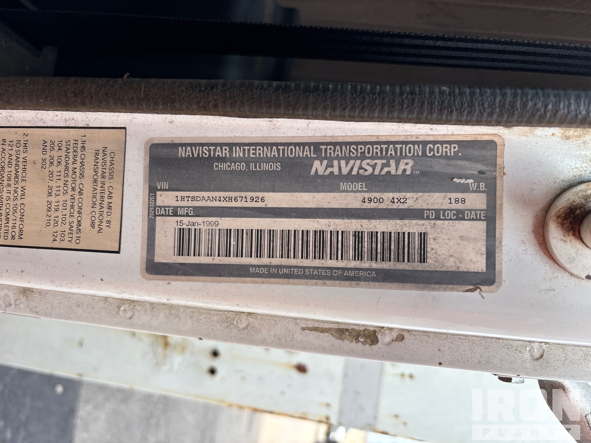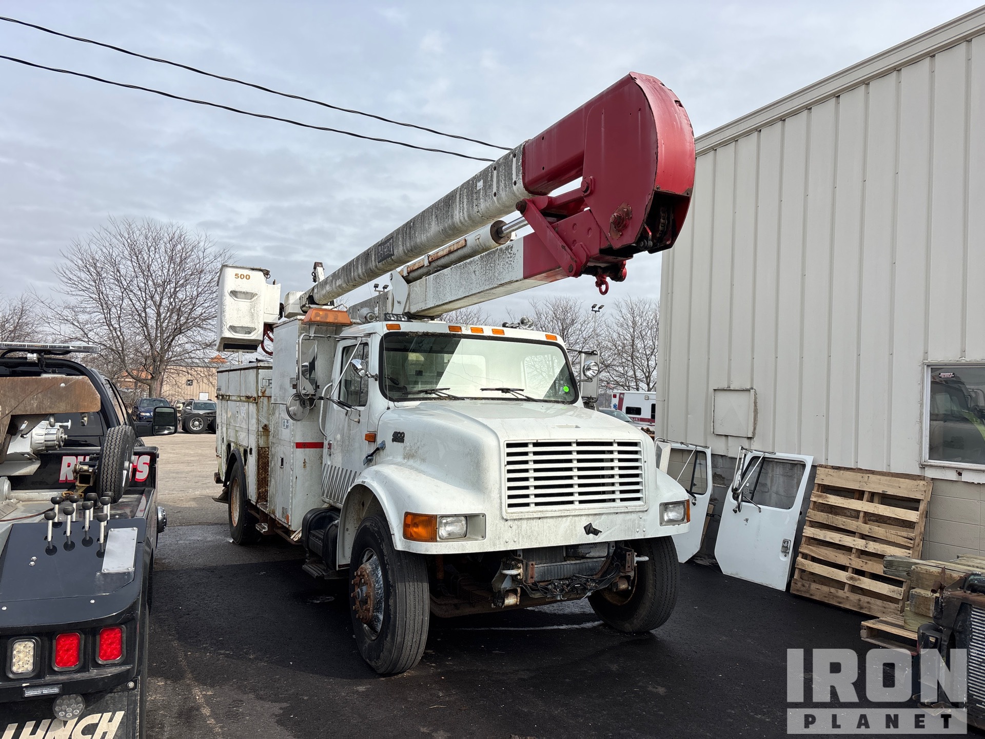 Moteur diesel International DT466E 6 cylindres 7,6 L 250 ch, homologué EPA 1999, transmission automatique Allison, pneus 11R22.5, suspension à ressorts, empattement de 4,78 m, prise de force, capacité de levage de 227 kg, flèche articulée monoplace montée à l'arrière, benne utilitaire, treuil en bout de flèche, stabilisateurs avant et arrière, plateau de 4,57 m x 2,36 m, attelage à anneau