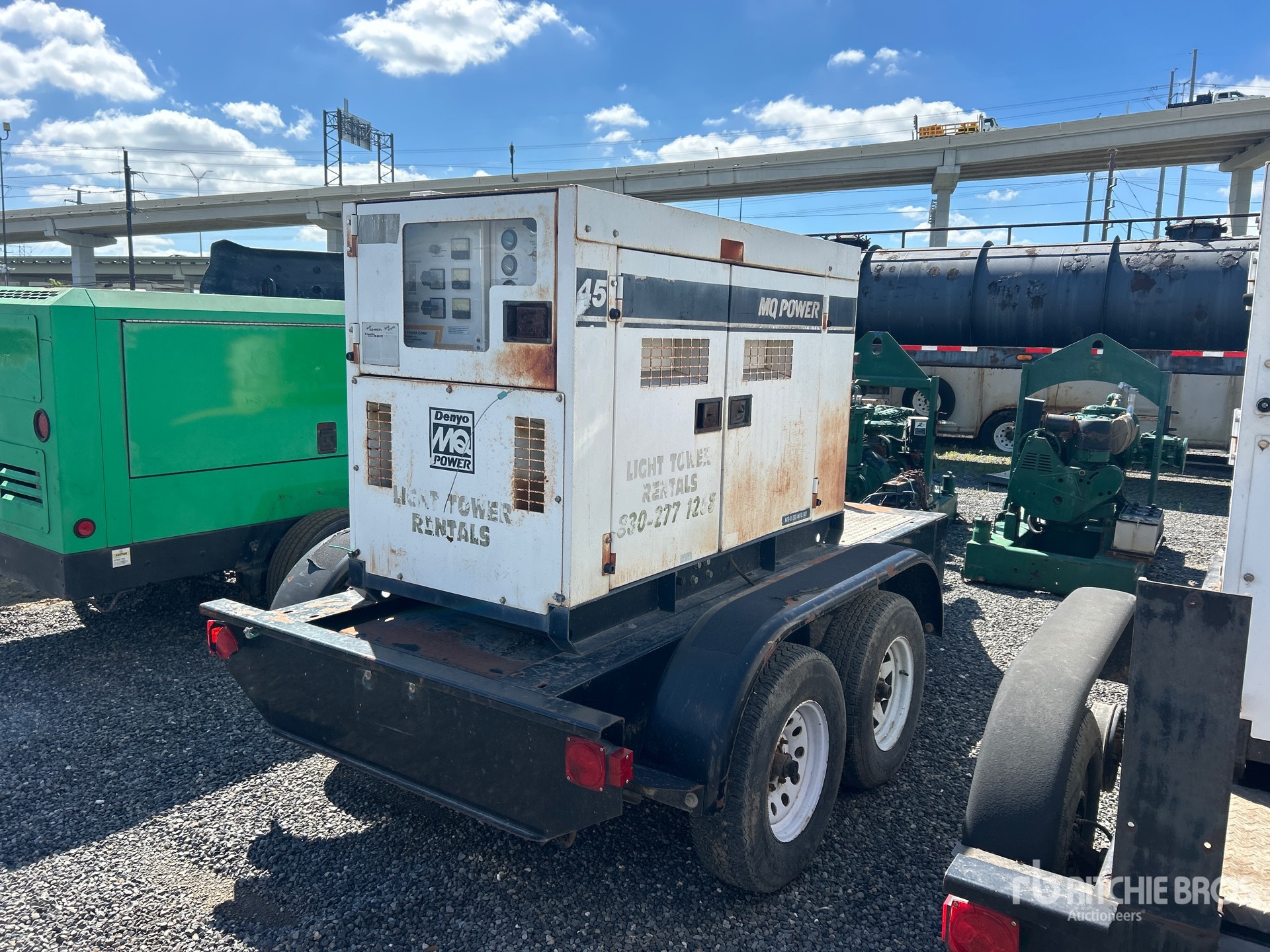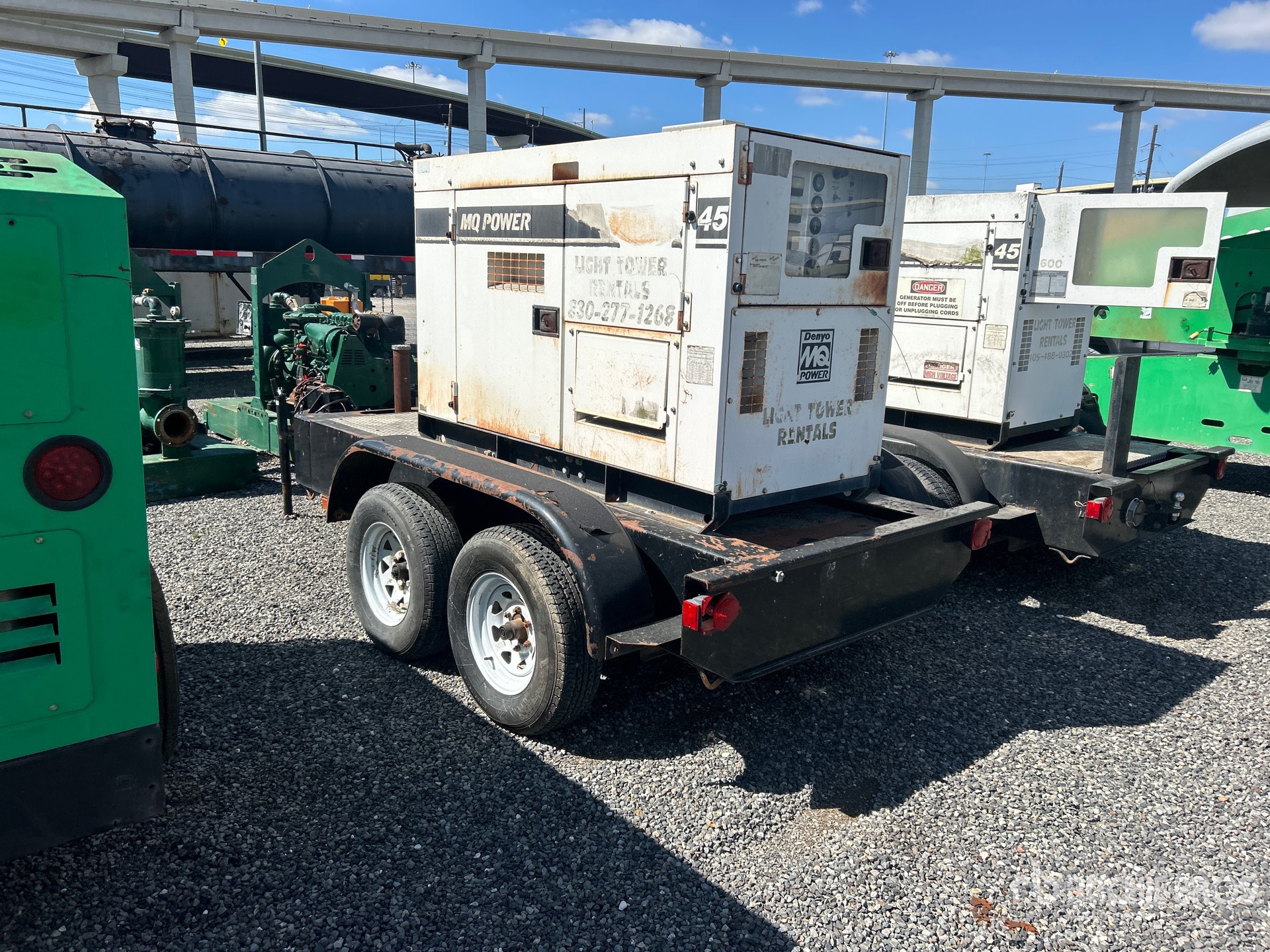Moteur diesel Isuzu 4 cylindres 4 L, puissance nominale triphasée de 45 kVA/36 kW, tension nominale 240 V/480 V, puissance nominale monophasée de 26 kVA/26 kW, tension nominale 120 V/240 V, prises 240 V et 120 V, réservoir de carburant inférieur, attelage à boule pour remorque, freins à inertie
